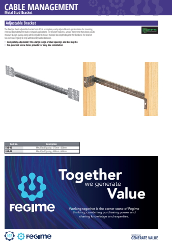 102CABLE MANAGEMENTTogether we GENERATE VALUEAdjustable BracketThe Fixxclips Fixed adjustable bracket from EFS is a complete, easily adjustable and quick solution for mounting electrical boxes between studs in drywall applications. The bracket features a unique fl ange end that allows you tomeasure & align quickly along with being able to mount multiple box depths beyond the standard. The brackethas increased rigidity to help withstand drywall installation.%u2022 Completely adjustable; fits a large range of stud spacings and box depths%u2022 Pre-punched screw holes provide for easy box installationPart No. DescriptionFAB-16 Metal Stud Spacing - 275mm - 450mmFAB-24 Metal Stud Spacing - 400mm - 600mmMetal Stud BracketTogetherValuewe generateWorking together is the corner stone of Fegime thinking; combining purchasing power and sharing knowledge and expertise.