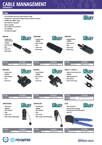 106CABLE MANAGEMENTTogether we GENERATE VALUESolar%u2022 Straight pair male & female%u2022 1500VDC%u2022 NEC Interlock %u2022 IP68%u2022 Pack of 50%u2022 With crimpsEMPV4NPart No. DescriptionEMPV4N Straight Connectors%u2022 Straight male%u2022 1500VDC%u2022 NEC Interlock %u2022 IP68%u2022 Pack of 100%u2022 With crimpsEMPV4MNPart No. DescriptionEMPV4MN Straight Connector %u2022 Straight female%u2022 1500VDC%u2022 NEC Interlock %u2022 IP68%u2022 Pack of 100%u2022 With crimpsEMPV4FNPart No. DescriptionEMPV4FN Straight Connector %u2022 Full certification across the solar connectors range%u2022 Straight pairs, inline fused straight, branch and panel connectors%u2022 1500VDC and 100VDC rating%u2022 NEC Interlock as standard%u2022 IP68 as standard%u2022 Solar toolkits and accessories%u2022 UK availability%u2022 Full technical support%u2022 Branch male%u2022 1500VDC%u2022 NEC Interlock %u2022 IP68%u2022 Pack of 50EBPV4MNPart No. DescriptionEBPV4MN Branch Connectors%u2022 Branch female%u2022 1500VDC%u2022 NEC Interlock %u2022 IP68%u2022 Pack of 50EBPV4FNPart No. DescriptionEBPV4FN Branch Connector %u2022 Spanner & disconnect tool%u2022 1500VDC%u2022 Tightening Spanner%u2022 Disconnector%u2022 Pack of 10 for eachEPVOS-S / EPVOS-UPart No. DescriptionEPVOS-SEPVOS-USpanner & Disconnect Tool%u2022 Panel male%u2022 1500VDC%u2022 NEC Interlock %u2022 IP68%u2022 Pack of 100%u2022 With crimps sealing plugsEMPVPCM4NPart No. DescriptionEMPVPCM4N PanelConnectors%u2022 Panel female%u2022 1500VDC%u2022 NEC Interlock %u2022 IP68%u2022 Pack of 100%u2022 With crimps and sealing plugsEMPVPCF4NPart No. DescriptionEMPVPCF4N Panel Connector Connectors%u2022 Solar Crimp Tool%u2022 Accurate Solar Crimping%u2022 Ensuring Low Contact Resistance%u2022 Pack Of 1ESCCTPart No. DescriptionESCCT Solar Crimp Tool
