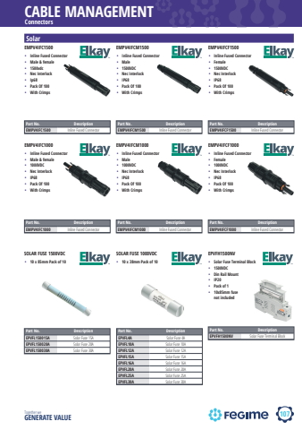 107CABLE MANAGEMENTTogether we GENERATE VALUESolarConnectors%u2022 Inline Fused Connector %u2022 Male & female%u2022 1500vdc%u2022 Nec Interlock %u2022 Ip68%u2022 Pack Of 100%u2022 With CrimpsEMPV4IFC1500Part No. DescriptionEMPV4IFC1500 Inline Fused Connector %u2022 Inline Fused Connector %u2022 Male %u2022 1500VDC%u2022 Nec Interlock %u2022 IP68%u2022 Pack Of 100%u2022 With CrimpsEMPV4IFCM1500Part No. DescriptionEMPV4IFCM1500 Inline Fused Connector %u2022 Inline Fused Connector %u2022 Female%u2022 1500VDC%u2022 Nec Interlock %u2022 IP68%u2022 Pack Of 100%u2022 With CrimpsEMPV4IFCF1500Part No. DescriptionEMPV4IFCF1500 Inline Fused Connector %u2022 Inline Fused Connector %u2022 Male & female%u2022 1000VDC%u2022 Nec Interlock %u2022 IP68%u2022 Pack Of 100%u2022 With CrimpsEMPV4IFC1000Part No. DescriptionEMPV4IFC1000 Inline Fused Connector %u2022 Inline Fused Connector %u2022 Male%u2022 1000VDC%u2022 Nec Interlock %u2022 IP68%u2022 Pack Of 100%u2022 With CrimpsEMPV4IFCM1000Part No. DescriptionEMPV4IFCM1000 Inline Fused Connector %u2022 Inline Fused Connector %u2022 Female%u2022 1000VDC%u2022 Nec Interlock %u2022 IP68%u2022 Pack Of 100%u2022 With CrimpsEMPV4IFCF1000Part No. DescriptionEMPV4IFCF1000 Inline Fused Connector %u2022 10 x 85mm Pack of 10SOLAR FUSE 1500VDCPart No. DescriptionEPVFL150015A Solar Fuse 15AEPVFL150020A Solar Fuse 20AEPVFL150030A Solar Fuse 30A%u2022 10 x 38mm Pack of 10SOLAR FUSE 1000VDCPart No. DescriptionEPVFL4A Solar Fuse 4AEPVFL10A Solar Fuse 10AEPVFL12A Solar Fuse 12AEPVFL15A Solar Fuse 15AEPVFL16A Solar Fuse 16AEPVFL20A Solar Fuse 20AEPVFL25A Solar Fuse 25AEPVFL30A Solar Fuse 30A%u2022 Solar Fuse Terminal Block%u2022 1500VDC%u2022 Din Rail Mount%u2022 IP20%u2022 Pack of 1%u2022 10x85mm fuse not includedEPVFH1500NVPart No. DescriptionEPVFH1500NV Solar Fuse Terminal Block