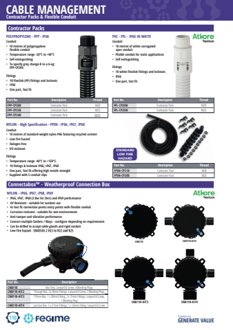 110CABLE MANAGEMENTTogether we GENERATE VALUEContractor Packs & Flexible ConduitContractor PacksPOLYPROPYLENE - FPP - IP66Conduit%u2022 10 metres of polypropylene flexible conduit%u2022 Temperature range -20%u00b0C to +90%u00b0C%u2022 Self extinguishing%u2022 To specify grey change B to a G eg: FPP-CP20GFittings%u2022 10 Flexilok (PP) fittings and locknuts%u2022 IP66%u2022 One part, fast fitPart No. Description ThreadFPP-CP20B Contractor Pack M20FPP-CP25B Contractor Pack M25FPP-CP34B Contractor Pack M32NYLON - High Specifi cation - FPEN - IP66, IP67, IP68Conduit%u2022 10 metres of standard weight nylon PA6 featuring recycled content%u2022 Low fire hazard%u2022 Halogen free%u2022 UV resistantFittings%u2022 Temperature range -40%u00b0C to +120%u00b0C.%u2022 10 fittings & locknuts IP66, IP67, IP68%u2022 One part, fast fit offering high tensile strength%u2022 Supplied with 5 conduit clipsPart No. Description ThreadFPEN-CP21B Contractor Pack M20FPEN-CP28B Contractor Pack M25STANDARDLOW FIRE HAZARDConnectabox%u2122 - Weatherproof Connection BoxNYLON - IP66, IP67, IP68, IP69%u2022 IP66, IP67, IP68 (2 Bar for 2hrs) and IP69 performance%u2022 UV Resistant - suitable for outdoor use%u2022 4x fast fit connection points entry points with flexible conduit%u2022 Corrosion resistant - suitable for wet environments%u2022 Anti-tamper and vibration performance%u2022 Connect multiple Outlets / Ways - configure depending on requirements%u2022 Can be drilled to accept cable glands and rigid conduit%u2022 Low Fire hazard - EN45545-2 HL3 to R22 and R23Part No. DescriptionCNB110 Box Only. Lanyard & Screw, 4 Blanking PlugsCNB110-KIT2 Through Box. 2x 28mm Fittings, Lanyard & Screw, 2 Blanking PlugsCNB110-KIT3 T-Piece Box. 1 x 28mm Fitting, 2 x 21mm Fittings, Lanyard & Screw, 1 Blanking PlugCNB110-KIT4 Junction Box. 3 x 21mm Fittings, 1 x 34mm Fitting, Lanyard & ScrewLow Fire hazard - EN45545-2 HL3 to R22 and R23CNB110 CNB110-KIT2Through Box. 2x 28mm Fittings, Lanyard & Screw, 2 Blanking PlugsT-Piece Box. 1 x 28mm Fitting, 2 x 21mm Fittings, Lanyard & Screw, CNB110-KIT3 CNB110-KIT4Part No. Description ThreadFPL-CP20W Contractor Pack M20FPL-CP25W Contractor Pack M25PVC - FPL - IP66 IN WHITEConduit%u2022 10 metres of white corrugated upvc conduit%u2022 Pliable conduit for static applications%u2022 Self extinguishingFittings%u2022 10 white Flexilok fittings and locknuts%u2022 IP66%u2022 One part, fast fit