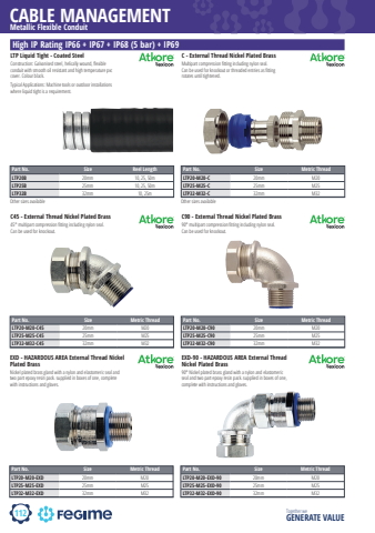 112CABLE MANAGEMENTTogether we GENERATE VALUEHigh IP Rating IP66 + IP67 + IP68 (5 bar) + IP69LTP Liquid Tight - Coated SteelConstruction: Galvanised steel, helically wound, fl exible conduit with smooth oil resistant and high temperature pvc cover. Colour black.Typical Applications: Machine tools or outdoor installations where liquid tight is a requirement.Part No. Size Reel LengthLTP20B 20mm 10, 25, 50mLTP25B 25mm 10, 25, 50mLTP32B 32mm 10, 25mC - External Thread Nickel Plated Brass Multipart compression fi tting including nylon seal. Can be used for knockout or threaded entries as fi tting rotates until tightened.Part No. Size Metric ThreadLTP20-M20-C 20mm M20LTP25-M25-C 25mm M25LTP32-M32-C 32mm M32C90 - External Thread Nickel Plated Brass 90%u00b0 multipart compression fi tting including nylon seal. Can be used for knockout.Part No. Size Metric ThreadLTP20-M20-C90 20mm M20LTP25-M25-C90 25mm M25LTP32-M32-C90 32mm M32C45 - External Thread Nickel Plated Brass45%u00b0 multipart compression fi tting including nylon seal. Can be used for knockout.Part No. Size Metric ThreadLTP20-M20-C45 20mm M20LTP25-M25-C45 25mm M25LTP32-M32-C45 32mm M32Metallic Flexible ConduitEXD-90 - HAZARDOUS AREA External Thread Nickel Plated Brass 90%u00b0 Nickel plated brass gland with a nylon and elastomeric seal and two part epoxy resin pack. supplied in boxes of one, complete with instructions and gloves.Part No. Size Metric ThreadLTP20-M20-EXD-90 20mm M20LTP25-M25-EXD-90 25mm M25LTP32-M32-EXD-90 32mm M32EXD - HAZARDOUS AREA External Thread Nickel Plated BrassNickel plated brass gland with a nylon and elastomeric seal and two part epoxy resin pack. supplied in boxes of one, complete with instructions and gloves.Part No. Size Metric ThreadLTP20-M20-EXD 20mm M20LTP25-M25-EXD 25mm M25LTP32-M32-EXD 32mm M32Other sizes available Other sizes available