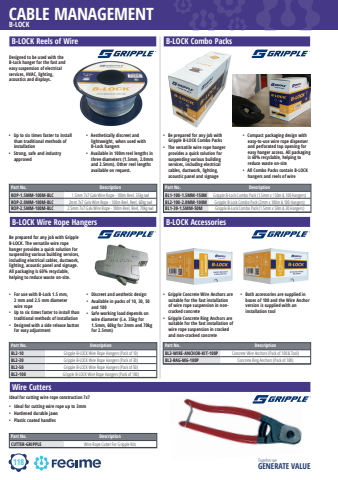118CABLE MANAGEMENTTogether we GENERATE VALUEB-LOCKB-LOCK Reels of WirePart No. DescriptionROP-1.5MM-100M-BLC 1.5mm 7x7 Galv Wire Rope - 100m Reel, 35kg swlROP-2.0MM-100M-BLC 2mm 7x7 Galv Wire Rope - 100m Reel, Reel, 60kg swlROP-2.5MM-100M-BLC 2.5mm 7x7 Galv Wire Rope - 100m Reel, Reel, 70kg swlB-LOCK Combo PacksB-LOCK Wire Rope HangersPart No. DescriptionBL2-10 Gripple B-LOCK Wire Rope Hangers (Pack of 10)BL2-30 Gripple B-LOCK Wire Rope Hangers (Pack of 30)BL2-50 Gripple B-LOCK Wire Rope Hangers (Pack of 50)BL2-100 Gripple B-LOCK Wire Rope Hangers (Pack of 100)B-LOCK AccessoriesWire CuttersPart No. DescriptionBL2-WIRE-ANCHOR-KIT-100P Concrete Wire Anchors (Pack of 100 & Tool)BL2-RAG-M6-100P Concrete Ring Anchors (Pack of 100)Part No. DescriptionCUTTER-GRIPPLE Wire Rope Cutter For Gripple KitsDesigned to be used with the B-Lock hanger for the fast and easy suspension of electrical services, HVAC, lighting, acoustics and displays.%u2022 Up to six times faster to install than traditional methods of installation%u2022 Strong, safe and industry approved%u2022 Aesthetically discreet and lightweight, when used with B-Lock hangers%u2022 Available in 100m reel lengths in three diameters (1.5mm, 2.0mm and 2.5mm). Other reel lengths available on request.%u2022 Be prepared for any job with Gripple B-LOCK Combo Packs%u2022 The versatile wire rope hanger provides a quick solution for suspending various building services, including electrical cables, ductwork, lighting, acoustic panel and signage%u2022 Compact packaging design with easy-to-use wire rope dispenser and perforated top opening for easy hanger access. All packaging is 60% recyclable, helping to reduce waste on-site%u2022 All Combo Packs contain B-LOCK hangers and reels of wireBe prepared for any job with Gripple B-LOCK. The versatile wire rope hanger provides a quick solution for suspending various building services, including electrical cables, ductwork, lighting, acoustic panel and signage. All packaging is 60% recyclable, helping to reduce waste on-site.%u2022 For use with B-Lock 1.5 mm, 2 mm and 2.5 mm diameter wire rope %u2022 Up to six times faster to install than traditional methods of installation%u2022 Designed with a side release button for easy adjustment%u2022 Discreet and aesthetic design%u2022 Available in packs of 10, 30, 50 and 100%u2022 Safe working load depends on wire diameter (i.e. 35kg for 1.5mm, 60kg for 2mm and 70kg for 2.5mm)%u2022 Gripple Concrete Wire Anchors are suitable for the fast installation of wire rope suspension in noncracked concrete%u2022 Gripple Concrete Ring Anchors are suitable for the fast installation of wire rope suspension in cracked and non-cracked concrete%u2022 Both accessories are supplied in boxes of 100 and the Wire Anchor version is supplied with an installation toolIdeal for cutting wire rope construction 7x7%u2022 Ideal for cutting wire rope up to 3mm%u2022 Hardened durable jaws%u2022 Plastic coated handlesPart No. DescriptionBL1-100-1.5MM-150M Gripple B-Lock Combo Pack (1.5mm x 150m & 100 Hangers)BL2-100-2.0MM-100M Gripple B-Lock Combo Pack (2mm x 100m & 100 Hangers)BL1-30-1.5MM-50M Gripple B-Lock Combo Pack (1.5mm x 50m & 30 Hangers)
