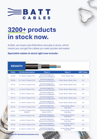 BS5467HCode Article description Desc 2 Desc 3 ABC Class55108 2 x 16mm2 (Class 2 CU) XLPE/PVC/SWA/PVC Black 0.6/1kv BS5467H Cores: Brown, Blue AA55109 3 x 1.5mm2 (Class 2 CU) XLPE/PVC/SWA/PVC Black 0.6/1KV BS5467H Cores: Brown, Black, Grey AA55110 3 x 2.5mm2 (Class 2 CU) XLPE/PVC/SWA/PVC Black 0.6/1KV BS5467H Cores: Brown, Black, Grey AA55111 3 x 4mm2 (Class 2 CU) XLPE/PVC/SWA/PVC Black 0.6/1KV BS5467H Cores: Brown, Black, Grey AA55113 3 x 6mm2 (Class 2 CU) XLPE/PVC/SWA/PVC Black 0.6/1kv BS5467H Cores: Brown, Black, Grey AA55115 3 x 10mm2 (Class 2 CU) XLPE/PVC/SWA/PVC Black 0.6/1KV BS5467H Cores: Brown, Black, Grey AA55116 3 x 16mm2 (Class 2 CU) XLPE/PVC/SWA/PVC Black 0.6/1kV BS5467H Cores: Brown, Black, Grey AA55118 4 x 1.5mm2 (Class 2 CU) XLPE/PVC/SWA/PVC Black 0.6/1KV BS5467HCores: Brown, Black, Grey, Blue AA55121 4 x 2.5mm2 (Class 2 CU) BS5467XLPE/PVC/SWA/PVC Black 0.6/1kVCores: Brown, Black, Grey, Blue AA55123 4 x 4mm2 (Class 2 CU) XLPE/PVC/SWA/PVC Black 0.6/1kv BS5467HCores: Brown, Black, Grey, Blue AA55124 4 x 6mm2 (Class 2 CU) XLPE/PVC/SWA/PVC Black 0.6/1kv BS5467HCores: Brown, Black, Grey, Blue AA55126 4 x 10mm2 (Class 2 CU) XLPE/PVC/SWA/PVC Black 0.6/1kv BS5467HCores: Brown, Black, Grey, Blue AA55129 4 x 16mm2 (Class 2 CU) XLPE/PVC/SWA/PVC Black 0.6/1kV BS5467HCores: Brown, Black, Grey, Blue AAImages for Illustrative purposes only3200+ productsin stock now.At Batt, we invest over %u00a350million annually in stock, which means you can get the cables you need quicker and easier. Specialist cables in stock right now include: