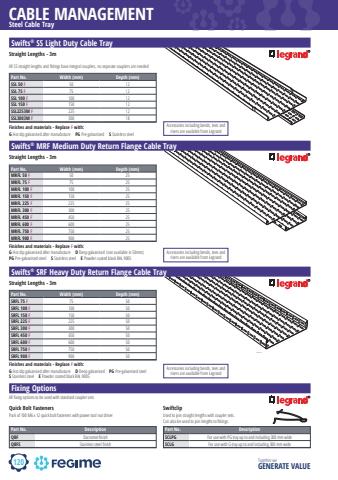 120CABLE MANAGEMENTTogether we GENERATE VALUESwifts%u00ae SS Light Duty Cable TraySteel Cable TrayPart No. Width (mm) Depth (mm)SSL 50 F 50 12SSL 75 F 75 12SSL 100 F 100 12SSL 150 F 150 12SSL2253M F 225 12SSL3003M F 300 18Straight Lengths - 3mAll SS straight lengths and fi ttings have integral couplers, no separate couplers are neededFinishes and materials - Replace F with:G Hot dip galvanised after manufacture PG Pre-galvanised S Stainless steelSwifts%u00ae MRF Medium Duty Return Flange Cable TrayPart No. Width (mm) Depth (mm)MRFL 50 F 50 25MRFL 75 F 75 25MRFL 100 F 100 25MRFL 150 F 150 25MRFL 225 F 225 25MRFL 300 F 300 25MRFL 450 F 450 25MRFL 600 F 600 25MRFL 750 F 750 25MRFL 900 F 900 25Straight Lengths - 3mFinishes and materials - Replace F with:G Hot dip galvanised after manufacture D Deep galvanised (not available in 50mm) PG Pre-galvanised steel S Stainless steel E Powder coated black RAL 9005Swifts%u00ae SRF Heavy Duty Return Flange Cable TrayPart No. Width (mm) Depth (mm)SRFL 75 F 75 50SRFL 100 F 100 50SRFL 150 F 150 50SRFL 225 F 225 50SRFL 300 F 300 50SRFL 450 F 450 50SRFL 600 F 600 50SRFL 750 F 750 50SRFL 900 F 900 50Straight Lengths - 3mFinishes and materials - Replace F with:G Hot dip galvanised after manufacture D Deep galvanised PG Pre-galvanised steel S Stainless steel E Powder coated black RAL 9005Fixing OptionsPart No. DescriptionQBF Dacromet fi nishQBFS Stainless steel fi nishQuick Bolt FastenersAll fi xing options to be used with standard coupler setsPack of 100 M6 x 12 quick bolt fasteners with power tool nut driverPart No. DescriptionSCLPG For use with PG tray up to and including 300 mm wideSCLG For use with G tray up to and including 300 mm wideSwiftclipUsed to join straight lengths with coupler sets. Can also be used to join lengths to fi ttings.Accessories including bends, tees and risers are available from LegrandAccessories including bends, tees and risers are available from LegrandAccessories including bends, tees and risers are available from Legrand