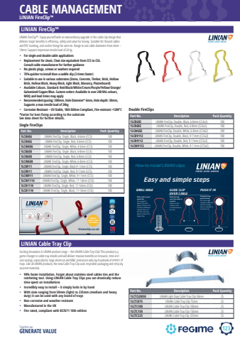 123 Together we GENERATE VALUECABLE MANAGEMENTlinianLINIAN FireClip%u2122LINIAN FireClip%u2122LINIAN Cable Tray ClipPart No. Description Pack Quantity1LCB406 LINIAN FireClip, Single, Black, 4-6mm (CC3) 1001LCR406 LINIAN FireClip, Single, Red, 4-6mm (CC3) 1001LCW406 LINIAN FireClip, Single, White, 4-6mm (CC3) 1001LCB608 LINIAN FireClip, Single, Black, 6-8mm (CC4) 1001LCR608 LINIAN FireClip, Single, Red, 6-8mm (CC4) 1001LCW608 LINIAN FireClip, Single, White, 6-8mm (CC4) 1001LCB911 LINIAN FireClip, Single, Black 9-11mm (CC5) 1001LCR911 LINIAN FireClip, Single, Red, 9-11mm (CC5) 1001LCW911 LINIAN FireClip, Single, White, 9-11mm (CC5) 1001LCW1114 LINIAN FireClip, Single, White, 11-14mm (CC6) 1001LCR1114 LINIAN FireClip, Single, Red, 11-14mm (CC6) 1001LCB1114 LINIAN FireClip, Single, Black, 11-14mm (CC6) 100LINIAN FireClip%u2122. Equip yourself with an extraordinary upgrade in fi re cable clip design that delivers major benefi ts in effi ciency, safety and value for money. Suitable for: Round cables and PVC trunking, and anchor fi xings for wire etc. Range to suit cable diameters from 4mm %u2013 14mm. Support impressive tensile load of 24 kg.%u2022 For single and double cable applications%u2022 Replacement for cleats. Cleat size equivalent from CC3 to CC6. Consult cable manufacturer for further guidance%u2022 No plastic plugs, screws or washers required%u2022 70% quicker to install than a saddle clip (3 times faster)%u2022 Suitable to use in various substrates (Stone, Concrete, Timber, Brick, Hollow Brick, Hollow Block, Heavy Block, Light Block, Masonry, Plasterboard) %u2022 Available Colours. Standard: Red/Black/White/Cream/Purple/Yellow/Orange/Galvanised/Copper/Blue. Custom orders: Available in over 200 RAL colours, MOQ and lead times may apply%u2022 Recommended spacing: 300mm, Hole Diameter* 6mm, Hole depth: 30mm, Supports a max tensile load of 24kg %u2022 Corrosion Resistant %u2013 UV Stable, 18th Edition Compliant, Fire-resistant >1200%u00b0C*Varies for best fixing according to the substrate See data sheet for further details. Part No. Description Pack Quantity1LCB682 LINIAN FireClip, Double, Black, 6-8mm (CC4x2) 1001LCR682 LINIAN FireClip, Double, Red, 6-8mm (CC4x2) 1001LCW682 LINIAN FireClip, Double, White, 6-8mm (CC4x2) 1001LCB9112 LINIAN FireClip, Double, Black, 9-11mm (CC5x2) 1001LCR9112 LINIAN FireClip, Double, Red, 9-11mm (CC5x2) 1001LCW9112 LINIAN FireClip, Double, White, 9-11mm (CC5x2) 100Part No. Description Pack Quantity1LCTCLD050 LINIAN Light Duty Cable Tray Clip 50mm 251LCTC075 LINIAN Cable Tray Clip 75mm 251LCTC100 LINIAN Cable Tray Clip 100mm 251LCTC150 LINIAN Cable Tray Clip 150mm 251LCTC225 LINIAN Cable Tray Clip 225mm 25Single FireClipsDouble FireClipsTMlinianclip.co.ukReplacesCleats, P-Clipsand SaddlesEel ctricCable orConduitEasy and simple stepsDrill a hole in yoursubstrateWe suggest a%u00d86mm hole at adepth of 30mm. forFireClips/T&EClips/Coaxial Clips or a%u00d810mm hole at adepth of 40mm forSuperClips.Slide the clipover the cable orconduitMake sure it'sseated in therounded area ofthe clip.Compress andpush it homePinch the legstogether and pushinto the hole byhand or tap with asoft hammer.Eel ctricCable orConduitDRILL HOLE SLIDE CLIP PUSH IT IN OVER CABLEHow to install LINIAN clipsExciting innovation in LINIAN product range %u2013 the LINIAN Cable Tray Clip! This product is a game changer in cable tray installs and will deliver massive benefits on resource, time and cost savings, especially for large electrical and M&E contractors who lay hundreds of meters of trays. Like all LINIAN products, the new Cable Tray Clip uses recyclable packaging and ethically sourced materials.%u2022 90% faster installation. Forget about stainless steel cables ties and the ratcheting tool. Using LINIAN Cable Tray Clips you can drastically reduce time spent on installations %u2022 Incredibly easy to install %u2013 it simply locks in by hand %u2022 With sizes ranging from 50mm (light) to 225mm (medium and heavy duty) it can be used with any brand of trays %u2022 Non corrosive and weather resistant %u2022 Manufactured in the UK %u2022 Fire rated, compliant with BS7671 18th editiontrays. Like all LINIAN products, the new Cable Tray Clip uses recyclable packaging and ethically Exciting innovation in LINIAN product range %u2013 the LINIAN Cable Tray Clip! This product is a game changer in cable tray installs and will deliver massive benefits on resource, time and cost savings, especially for large electrical and M&E contractors who lay hundreds of meters of