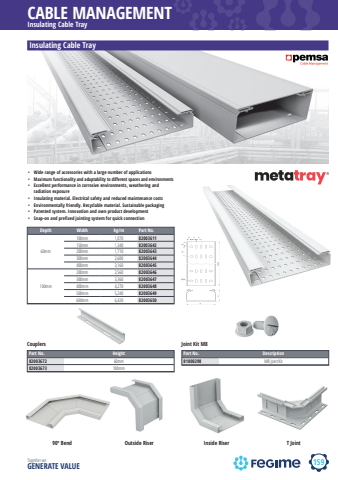 159CABLE MANAGEMENTTogether we GENERATE VALUEInsulating Cable TrayDepth Width kg/m Part No.60mm100mm 1,070 82003611150mm 1,340 82003642200mm 1,710 82003643300mm 2,600 82003644400mm 3,160 82003645100mm200mm 2,560 82003646300mm 3,360 82003647400mm 4,270 82003648500mm 5,240 82003649600mm 6,420 82003650Insulating Cable TrayPart No. Height82003672 60mm82003673 100mmCouplersPart No. Description81000298 M8 Joint KitJoint Kit M890%u00ba Bend Outside Riser Inside Riser T Joint%u2022 Wide range of accessories with a large number of applications %u2022 Maximum functionality and adaptability to different spaces and environments%u2022 Excellent performance in corrosive environments, weathering and radiation exposure%u2022 Insulating material. Electrical safety and reduced maintenance costs%u2022 Environmentally friendly. Recyclable material. Sustainable packaging%u2022 Patented system. Innovation and own product development%u2022 Snap-on and prefixed jointing system for quick connection3000%u00d817x95025 252525