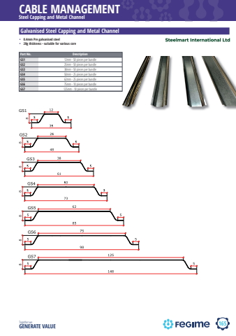 165CABLE MANAGEMENTTogether we GENERATE VALUEsteelmart international ltdSteel Capping and Metal ChannelGalvanised Steel Capping and Metal Channel%u2022 0.4mm Pre galvanised steel%u2022 28g thickness - suitable for various corePart No. DescriptionGS1 12mm - 50 pieces per bundleGS2 25mm - 50 pieces per bundleGS3 38mm - 50 pieces per bundleGS4 50mm - 25 pieces per bundleGS5 62mm - 25 pieces per bundleGS6 75mm - 10 pieces per bundleGS7 125mm - 10 pieces per bundle