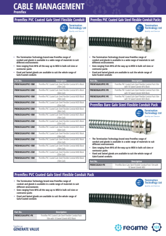 169CABLE MANAGEMENTTogether we GENERATE VALUEPremflex Premflex PVC Coated Galv Steel Flexible ConduitPart No. DescriptionPREM16GALVPVC-10M Premfl ex PVC Coated Galv Steel Flexible Conduit M16 Black (10m Coil)PREM16GALVPVC-50M Premfl ex PVC Coated Galv Steel Flexible Conduit M16 Black (50m Coil)PREM20GALVPVC-10M Premfl ex PVC Coated Galv Steel Flexible Conduit M20 Black (10m Coil)PREM20GALVPVC-25M Premfl ex PVC Coated Galv Steel Flexible Conduit M20 Black (25m Coil)PREM20GALVPVC-50M Premfl ex PVC Coated Galv Steel Flexible Conduit M20 Black (50m Coil)PREM25GALVPVC-10M Premfl ex PVC Coated Galv Steel Flexible Conduit M25 Black (10m Coil)PREM25GALVPVC-25M Premfl ex PVC Coated Galv Steel Flexible Conduit M25 Black (25m Coil)PREM25GALVPVC-50M Premfl ex PVC Coated Galv Steel Flexible Conduit M25 Black (50m Coil)PREM32GALVPVC-10M Premfl ex PVC Coated Galv Steel Flexible Conduit M32 Black (10m Coil)PREM32GALVPVC-25M Premfl ex PVC Coated Galv Steel Flexible Conduit M32 Black (25m Coil)PREM40GALVPVC-10M Premfl ex PVC Coated Galv Steel Flexible Conduit M40 Black (10m Coil)PREM40GALVPVC-25M Premfl ex PVC Coated Galv Steel Flexible Conduit M40 Black (25m Coil)PREM50GALVPVC-10M Premfl ex PVC Coated Galv Steel Flexible Conduit M50 Black (10m Coil)%u2022 The Termination Technology brand new Premflex range of conduit and glands is available in a wide range of materials to suit different environments%u2022 Sizes ranging from M16 all the way up to M50 in bulk coil sizes or contractor packs%u2022 Fixed and Swivel glands are available to suit the whole range of Galv/Coated conduitsPremflex PVC Coated Galv Steel Flexible Conduit PacksPart No. DescriptionPREM16GALVPVC-PK Premfl ex PVC Coated Galv Steel Flexible Conduit Pack 10m with 10 Swivel Glands M16 BlackPREM20GALVPVC-PK Premfl ex PVC Coated Galv Steel Flexible Conduit Pack 10m with 10 Swivel Glands M20 BlackPREM25GALVPVC-PK Premfl ex PVC Coated Galv Steel Flexible Conduit Pack 10m with 10 Swivel Glands M25 Black%u2022 The Termination Technology brand new Premflex range of conduit and glands is available in a wide range of materials to suit different environments%u2022 Sizes ranging from M16 all the way up to M50 in bulk coil sizes or contractor packs%u2022 Fixed and Swivel glands are available to suit the whole range of Galv/Coated conduitsPremflex Bare Galv Steel Flexible Conduit PackPart No. DescriptionPREM32GALV-PK Premfl ex Bare Galv Steel Flexible Conduit Pack 10m with 10 Swivel Glands M32%u2022 The Termination Technology brand new Premflex range of conduit and glands is available in a wide range of materials to suit different environments%u2022 Sizes ranging from M16 all the way up to M50 in bulk coil sizes or contractor packs%u2022 Fixed and Swivel glands are available to suit the whole range of Galv/Coated conduitsPremflex PVC Coated Galv Steel Flexible Conduit PackPart No. DescriptionPREM32GALVPVC-PK Premfl ex PVC Coated Galv Steel Flexible Conduit Pack 10m with 10 Swivel Glands M32 Black%u2022 The Termination Technology brand new Premflex range of conduit and glands is available in a wide range of materials to suit different environments%u2022 Sizes ranging from M16 all the way up to M50 in bulk coil sizes or contractor packs%u2022 Fixed and Swivel glands are available to suit the whole range of Galv/Coated conduits