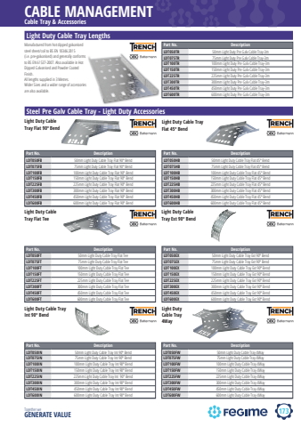 173CABLE MANAGEMENTTogether we GENERATE VALUECable Tray & AccessoriesManufactured from hot dipped galvanised steel sheet/coil to BS EN 10346:2015 (i.e. pre-galvanised) and generally conforms to BS EN 61537-2007. Also available in Hot Dipped Galvanised and Powder Coated Finish. All lengths supplied in 3 Metres. Wider Sizes and a wider range of accessories are also available.Light Duty Cable Tray LengthsPart No. DescriptionLDT050TR 50mm Light Duty Pre Galv Cable Tray-3mLDT075TR 75mm Light Duty Pre Galv Cable Tray-3mLDT100TR 100mm Light Duty Pre Galv Cable Tray-3mLDT150TR 150mm Light Duty Pre Galv Cable Tray-3mLDT225TR 225mm Light Duty Pre Galv Cable Tray-3mLDT300TR 300mm Light Duty Pre Galv Cable Tray-3mLDT450TR 450mm Light Duty Pre Galv Cable Tray-3mLDT600TR 600mm Light Duty Pre Galv Cable Tray-3mLight Duty Cable Tray Flat 90%u00ba BendPart No. DescriptionLDT050FB 50mm Light Duty Cable Tray Flat 90%u00ba BendLDT075FB 75mm Light Duty Cable Tray Flat 90%u00ba BendLDT100FB 100mm Light Duty Cable Tray Flat 90%u00ba BendLDT150FB 150mm Light Duty Cable Tray Flat 90%u00ba BendLDT225FB 225mm Light Duty Cable Tray Flat 90%u00ba BendLDT300FB 300mm Light Duty Cable Tray Flat 90%u00ba BendLDT450FB 450mm Light Duty Cable Tray Flat 90%u00ba BendLDT600FB 600mm Light Duty Cable Tray Flat 90%u00ba BendSteel Pre Galv Cable Tray - Light Duty AccessoriesLight Duty Cable Tray Flat TeePart No. DescriptionLDT050FT 50mm Light Duty Cable Tray Flat TeeLDT075FT 75mm Light Duty Cable Tray Flat TeeLDT100FT 100mm Light Duty Cable Tray Flat TeeLDT150FT 150mm Light Duty Cable Tray Flat TeeLDT225FT 225mm Light Duty Cable Tray Flat TeeLDT300FT 300mm Light Duty Cable Tray Flat TeeLDT450FT 450mm Light Duty Cable Tray Flat TeeLDT600FT 600mm Light Duty Cable Tray Flat TeeLight Duty Cable Tray Ext 90%u00ba BendLight Duty Cable Tray Int 90%u00ba BendPart No. DescriptionLDT050IN 50mm Light Duty Cable Tray Int 90%u00ba BendLDT075IN 75mm Light Duty Cable Tray Int 90%u00ba BendLDT100IN 100mm Light Duty Cable Tray Int 90%u00ba BendLDT150IN 150mm Light Duty Cable Tray Int 90%u00ba BendLDT225IN 225mm Light Duty Cable Tray Int 90%u00ba BendLDT300IN 300mm Light Duty Cable Tray Int 90%u00ba BendLDT450IN 450mm Light Duty Cable Tray Int 90%u00ba BendLDT600IN 600mm Light Duty Cable Tray Int 90%u00ba BendPart No. DescriptionLDT050EX 50mm Light Duty Cable Tray Ext 90%u00ba BendLDT075EX 75mm Light Duty Cable Tray Ext 90%u00ba BendLDT100EX 100mm Light Duty Cable Tray Ext 90%u00ba BendLDT150EX 150mm Light Duty Cable Tray Ext 90%u00ba BendLDT225EX 225mm Light Duty Cable Tray Ext 90%u00ba BendLDT300EX 300mm Light Duty Cable Tray Ext 90%u00ba BendLDT450EX 450mm Light Duty Cable Tray Ext 90%u00ba BendLDT600EX 600mm Light Duty Cable Tray Ext 90%u00ba BendLight Duty Cable Tray Flat 45%u00ba BendPart No. DescriptionLDT050HB 50mm Light Duty Cable Tray Flat 45%u00ba BendLDT075HB 75mm Light Duty Cable Tray Flat 45%u00ba BendLDT100HB 100mm Light Duty Cable Tray Flat 45%u00ba BendLDT150HB 150mm Light Duty Cable Tray Flat 45%u00ba BendLDT225HB 225mm Light Duty Cable Tray Flat 45%u00ba BendLDT300HB 300mm Light Duty Cable Tray Flat 45%u00ba BendLDT450HB 450mm Light Duty Cable Tray Flat 45%u00ba BendLDT600HB 600mm Light Duty Cable Tray Flat 45%u00ba BendLight Duty Cable Tray 4WayPart No. DescriptionLDT050FW 50mm Light Duty Cable Tray 4Way LDT075FW 75mm Light Duty Cable Tray 4WayLDT100FW 100mm Light Duty Cable Tray 4WayLDT150FW 150mm Light Duty Cable Tray 4WayLDT225FW 225mm Light Duty Cable Tray 4WayLDT300FW 300mm Light Duty Cable Tray 4WayLDT450FW 450mm Light Duty Cable Tray 4WayLDT600FW 600mm Light Duty Cable Tray 4Way