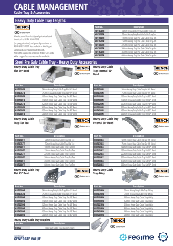 175CABLE MANAGEMENTTogether we GENERATE VALUEHeavy Duty Cable Tray Internal 90%u00ba BendHeavy Duty Cable Tray Flat 90%u00ba BendSteel Pre Galv Cable Tray - Heavy Duty AccessoriesPart No. DescriptionHDT050FB 50mm Heavy Duty Cable Tray Flat 90%u00ba BendHDT075FB 75mm Heavy Duty Cable Tray Flat 90%u00ba BendHDT100FB 100mm Heavy Duty Cable Tray Flat 90%u00ba BendHDT150FB 150mm Heavy Duty Cable Tray Flat 90%u00ba BendHDT225FB 225mm Heavy Duty Cable Tray Flat 90%u00ba BendHDT300FB 300mm Heavy Duty Cable Tray Flat 90%u00ba BendHDT450FB 450mm Heavy Duty Cable Tray Flat 90%u00ba BendHDT600FB 600mm Heavy Duty Cable Tray Flat 90%u00ba BendCable Tray & AccessoriesHeavy Duty Cable Tray LengthsPart No. DescriptionHDT050TR 50mm Heavy Duty Pre Galv Cable Tray-3mHDT075TR 75mm Heavy Duty Pre Galv Cable Tray-3mHDT100TR 100mm Heavy Duty Pre Galv Cable Tray-3mHDT150TR 150mm Heavy Duty Pre Galv Cable Tray-3mHDT225TR 225mm Heavy Duty Pre Galv Cable Tray-3mHDT300TR 300mm Heavy Duty Pre Galv Cable Tray-3mHDT450TR 450mm Heavy Duty Pre Galv Cable Tray-3mHDT600TR 600mm Heavy Duty Pre Galv Cable Tray-3mManufactured from hot dipped galvanised steel sheet/coil to BS EN 10346:2015 (i.e. pre-galvanised) and generally conforms to BS EN 61537-2007. Also available in Hot Dipped Galvanised and Powder Coated Finish. All lengths supplied in 3 Metres. Wider Sizes and a wider range of accessories are also available.Heavy Duty Cable Tray Flat TeePart No. DescriptionHDT050FT 50mm Heavy Duty Cable Tray Flat TeeHDT075FT 75mm Heavy Duty Cable Tray Flat TeeHDT100FT 100mm Heavy Duty Cable Tray Flat TeeHDT150FT 150mm Heavy Duty Cable Tray Flat TeeHDT225FT 225mm Heavy Duty Cable Tray Flat TeeHDT300FT 300mm Heavy Duty Cable Tray Flat TeeHDT450FT 450mm Heavy Duty Cable Tray Flat TeeHDT600FT 600mm Heavy Duty Cable Tray Flat TeePart No. DescriptionHDT050IN 50mm Heavy Duty Cable Tray Int 90%u00ba BendHDT075IN 75mm Heavy Duty Cable Tray Int 90%u00ba BendHDT100IN 100mm Heavy Duty Cable Tray Int 90%u00ba BendHDT150IN 150mm Heavy Duty Cable Tray Int 90%u00ba BendHDT225IN 225mm Heavy Duty Cable Tray Int 90%u00ba BendHDT300IN 300mm Heavy Duty Cable Tray Int 90%u00ba BendHDT450IN 450mm Heavy Duty Cable Tray Int 90%u00ba BendHDT600IN 600mm Heavy Duty Cable Tray Int 90%u00ba BendHeavy Duty Cable Tray External 90%u00ba BendPart No. DescriptionHDT050EX 50mm Heavy Duty Cable Tray Ext 90%u00ba BendHDT075EX 75mm Heavy Duty Cable Tray Ext 90%u00ba BendHDT100EX 100mm Heavy Duty Cable Tray Ext 90%u00ba BendHDT150EX 150mm Heavy Duty Cable Tray Ext 90%u00ba BendHDT225EX 225mm Heavy Duty Cable Tray Ext 90%u00ba BendHDT300EX 300mm Heavy Duty Cable Tray Ext 90%u00ba BendHDT450EX 450mm Heavy Duty Cable Tray Ext 90%u00ba BendHDT600EX 600mm Heavy Duty Cable Tray Ext 90%u00ba BendHeavy Duty Cable Tray Flat 45%u00ba BendPart No. DescriptionHDT050HB 50mm Heavy Duty Cable Tray Flat 45%u00ba BendHDT075HB 75mm Heavy Duty Cable Tray Flat 45%u00ba BendHDT100HB 100mm Heavy Duty Cable Tray Flat 45%u00ba BendHDT150HB 150mm Heavy Duty Cable Tray Flat 45%u00ba BendHDT225HB 225mm Heavy Duty Cable Tray Flat 45%u00ba BendHDT300HB 300mm Heavy Duty Cable Tray Flat 45%u00ba BendHDT450HB 450mm Heavy Duty Cable Tray Flat 45%u00ba BendHDT600HB 600mm Heavy Duty Cable Tray Flat 45%u00ba BendHeavy Duty Cable Tray 4Way Part No. DescriptionHDT050FW 50mm Heavy Duty Cable Tray 4Way HDT075FW 75mm Heavy Duty Cable Tray 4WayHDT100FW 100mm Heavy Duty Cable Tray 4WayHDT150FW 150mm Heavy Duty Cable Tray 4WayHDT225FW 225mm Heavy Duty Cable Tray 4WayHDT300FW 300mm Heavy Duty Cable Tray 4WayHDT450FW 450mm Heavy Duty Cable Tray 4WayHDT600FW 600mm Heavy Duty Cable Tray 4WayHeavy Duty Cable Tray couplersPart No. DescriptionHDTSC Heavy Duty Cable Tray couplers (pair)