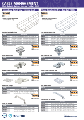 178CABLE MANAGEMENTTogether we GENERATE VALUEMagic Basket in Stainless Steel and Post Galv (HDG)Part No. Description6001070 55mm Deep x 50mm Wide Magic Stainless Steel A2 Basket - 3m6001072 55mm Deep x 100mm Wide Magic Stainless Steel A2 Basket - 3m6001074 55mm Deep x 150mm Wide Magic Stainless Steel A2 Basket - 3m6001076 55mm Deep x 200mm Wide Magic Stainless Steel A2 Basket - 3m6001078 55mm Deep x 300mm Wide Magic Stainless Steel A2 Basket - 3m55mm Deep Basket Tray - Stainless Steel**Other sizes available upon requestStainless Steel Basket TrayPart No. Description6001415 55mm Deep x 50mm Wide Magic Post Galv HDG Basket -3m6001416 55mm Deep x 100mm Wide Magic Post Galv HDG Basket -3m6001418 55mm Deep x 150mm Wide Magic Post Galv HDG Basket -3m6001420 55mm Deep x 200mm Wide Magic Post Galv HDG Basket -3m6001424 55mm Deep x 300mm Wide Magic Post Galv HDG Basket -3m55mm Deep Basket Tray - Post Galv (HDG)**Other sizes available upon requestPost Galv HDG Basket TrayPart No. Description6016634 Post Galv HDG Basket Joint Connector kits (per 20)Joint Connector Kits%u2022 Basket tray fitted with integral connector 55mm deepPart No. Description6015648 Post Galv HDG Basket 50mm Wide Fast Fix stand off bracket6015656 Post Galv HDG Basket 100mm Wide Fast Fix stand off bracket6015660 Post Galv HDG Basket 150mm Wide Fast Fix stand off bracket6015664 Post Galv HDG Basket 200mm Wide Fast Fix stand off bracket6015672 Post Galv HDG Basket 300mm Wide Fast Fix stand off bracketPart No. Description6016723 Post Galv HDG Basket Corner Connector kits (per 20)Basket Corner Connector KitsPart No. Description6015278 Post Galv HDG Basket Hold Down Clamp (per 50)Hold Down ClampsFast Fix Stand Off Brackets%u2022 Basket tray fitted with integral connector 55mm deepPart No. Description6016642 Stainless Steel Basket Joint Connector Kits (per 20)Joint Connector KitsPart No. Description6016731 Stainless Steel Basket Corner Connector Kits (per 20)Basket Corner Connector KitsPart No. Description6015280 Stainless Steel Basket Hold Down Clamp (per 20)6016676 Stainless Steel Basket Hold Down Clamp for 50mm Wide Basket (per 20)6016665 Stainless Steel Basket Fast Fix Hold Down Clip (per 20)Hold Down ClampsPart No. Description6015630 Stainless Steel Basket 100mm Wide Stand Off Bracket6015632 Stainless Steel Basket 200mm Wide Stand Off Bracket6015633 Stainless Steel Basket 300mm Wide Stand Off BracketStand Off Brackets