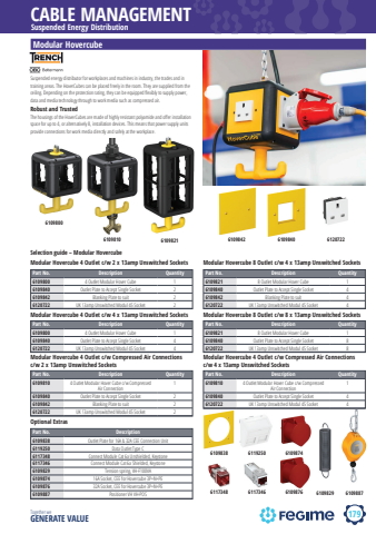 179CABLE MANAGEMENTTogether we GENERATE VALUESuspended Energy DistributionModular HovercubeSuspended energy distributor for workplaces and machines in industry, the trades and in training areas. The HoverCubes can be placed freely in the room. They are supplied from the ceiling. Depending on the protection rating, they can be equipped fl exibly to supply power, data and media technology through to work media such as compressed air.Robust and TrustedThe housings of the HoverCubes are made of highly resistant polyamide and off er installation space for up to 4, or alternatively 8, installation devices. This means that power supply units provide connections for work media directly and safely at the workplace.Selection guide %u2013 Modular HovercubeModular Hovercube 4 Outlet c/w 2 x 13amp Unswitched SocketsPart No. Description Quantity6109800 4 Outlet Modular Hover Cube 16109840 Outlet Plate to Accept Single Socket 26109842 Blanking Plate to suit 26120722 UK 13amp Unswitched Modul 45 Socket 2Modular Hovercube 4 Outlet c/w 4 x 13amp Unswitched SocketsPart No. Description Quantity6109800 4 Outlet Modular Hover Cube 16109840 Outlet Plate to Accept Single Socket 46120722 UK 13amp Unswitched Modul 45 Socket 4Modular Hovercube 8 Outlet c/w 4 x 13amp Unswitched SocketsPart No. Description Quantity6109821 8 Outlet Modular Hover Cube 16109840 Outlet Plate to Accept Single Socket 46109842 Blanking Plate to suit 46120722 UK 13amp Unswitched Modul 45 Socket 4Modular Hovercube 8 Outlet c/w 8 x 13amp Unswitched SocketsPart No. Description Quantity6109821 8 Outlet Modular Hover Cube 16109840 Outlet Plate to Accept Single Socket 86120722 UK 13amp Unswitched Modul 45 Socket 8Modular Hovercube 4 Outlet c/w Compressed Air Connectionsc/w 2 x 13amp Unswitched SocketsPart No. Description Quantity6109810 4 Outlet Modular Hover Cube c/w Compressed Air Connection16109840 Outlet Plate to Accept Single Socket 26109842 Blanking Plate to suit 26120722 UK 13amp Unswitched Modul 45 Socket 2Modular Hovercube 4 Outlet c/w Compressed Air Connectionsc/w 4 x 13amp Unswitched SocketsPart No. Description Quantity6109810 4 Outlet Modular Hover Cube c/w Compressed Air Connection16109840 Outlet Plate to Accept Single Socket 46120722 UK 13amp Unswitched Modul 45 Socket 4Optional ExtrasPart No. Description6109838 Outlet Plate for 16A & 32A CEE Connection Unit6119250 Data Outlet Type C6117348 Connect Module Cat 6a Unshielded, Keystone6117346 Connect Module Cat 6a Shielded, Keystone6109829 Tension spring, VH-F100VA6109874 16A Socket, CEE for Hovercube 3P+N+PE6109876 32A Socket, CEE for Hovercube 3P+N+PE6109887 Positioner VH VH-POS61098006109810 6109821 6109842 6109840 61207226117348 61173466109838 61192506109876 6109829 61098876109874