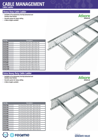 182CABLE MANAGEMENTTogether we GENERATE VALUECable LadderHeavy Duty Cable Ladder%u2022 Available in Pre-Galvanised, Hot-Dip Galvanised and Stainless Steel finishes%u2022 Versatile system for heavy cabling%u2022 6 Metre lengths availablePart No. DescriptionU12L3100 Heavy Duty Cable Ladder 100mm Wide 3MU12L3150 Heavy Duty Cable Ladder 150mm Wide 3MU12L3200 Heavy Duty Cable Ladder 200mm Wide 3MU12L3300 Heavy Duty Cable Ladder 300mm Wide 3MU12L3400 Heavy Duty Cable Ladder 400mm Wide 3MU12L3450 Heavy Duty Cable Ladder 450mm Wide 3MU12L3500 Heavy Duty Cable Ladder 500mm Wide 3MU12L3600 Heavy Duty Cable Ladder 600mm Wide 3MU12L3700 Heavy Duty Cable Ladder 700mm Wide 3MU12L3750 Heavy Duty Cable Ladder 750mm Wide 3MU12L3800 Heavy Duty Cable Ladder 800mm Wide 3MU12L3900 Heavy Duty Cable Ladder 900mm Wide 3MU12L31000 Heavy Duty Cable Ladder 1000mm Wide 3MU12L31200 Heavy Duty Cable Ladder 1200mm Wide 3MExtra Heavy Duty Cable Ladder%u2022 Available in Pre-Galvanised, Hot-Dip Galvanised and Stainless Steel finishes%u2022 Versatile system for heavy cabling%u2022 6 Metre lengths availablePart No. DescriptionU15L3100 Extra Heavy Duty Cable Ladder 100mm Wide 3MU15L3150 Extra Heavy Duty Cable Ladder 150mm Wide 3MU15L3200 Extra Heavy Duty Cable Ladder 200mm Wide 3MU15L3300 Extra Heavy Duty Cable Ladder 300mm Wide 3MU15L3400 Extra Heavy Duty Cable Ladder 400mm Wide 3MU15L3450 Extra Heavy Duty Cable Ladder 450mm Wide 3MU15L3500 Extra Heavy Duty Cable Ladder 500mm Wide 3MU15L3600 Extra Heavy Duty Cable Ladder 600mm Wide 3MU15L3700 Extra Heavy Duty Cable Ladder 700mm Wide 3MU15L3750 Extra Heavy Duty Cable Ladder 750mm Wide 3MU15L3800 Extra Heavy Duty Cable Ladder 800mm Wide 3MU15L3900 Extra Heavy Duty Cable Ladder 900mm Wide 3MU15L31000 Extra Heavy Duty Cable Ladder 1000mm Wide 3M