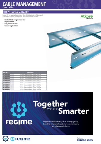 184CABLE MANAGEMENTTogether we GENERATE VALUECable LadderU11 Pre-Galvanised Ladder%u2022 Standard finish: pre-galvanised steel%u2022 Length: 3000mm%u2022 Rung distance: 250mm%u2022 Sidewall height: 110mmPart No. DescriptionU11L3200PG U11 Pre-Galvanised Ladder 200mm Wide 3MU11L3300PG U11 Pre-Galvanised Ladder 300mm Wide 3MU11L3400PG U11 Pre-Galvanised Ladder 400mm Wide 3MU11L3450PG U11 Pre-Galvanised Ladder 450mm Wide 3MU11L3500PG U11 Pre-Galvanised Ladder 500mm Wide 3MU11L3600PG U11 Pre-Galvanised Ladder 600mm Wide 3MU11L3750PG U11 Pre-Galvanised Ladder 750mm Wide 3MU11L3900PG U11 Pre-Galvanised Ladder 900mm Wide 3MUnistrut U11 pre-galvanised ladder has a 110mm high side wall with an S-shape profi le. A full range of accessories including bends, tees, crosses and risers available.Fegime is more than just a buying group, building relationships between members, suppliers and clients.Together Smarter we are
