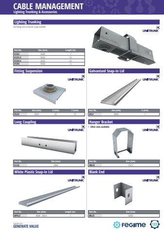 189CABLE MANAGEMENTTogether we GENERATE VALUELighting Trunking & AccessoriesLighting TrunkingPart No. Size (mm) Length (m)LT223 50x50 3LT223.5 50x50 3.5LT224.5 50x50 4.5LT226 50x50 6Fitting Suspension Galvanised Snap-In LidPart No. Size (mm) X (mm) Y (mm)FSL22 50x50 62 55White Plastic Snap-In Lid Blank EndLong Coupling Hanger BracketFull fi ttings and accessories range availablePart No. Size (mm) Length (m)WPL22 Width - 50mm 3Part No. Size (mm)BEL22 50x50Part No. Size (mm) X (mm)GCL2 50x50 2Part No. Size (mm)LCL22 50x50Part No. Size (mm)HBL22 75x75%u2022 Other sizes available