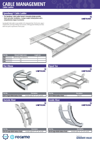 194CABLE MANAGEMENTTogether we GENERATE VALUESpeedway%u00ae Cable Ladder %u2022 The Speedway%u00ae Cable Ladder System%u2019s innovative design provides faster and easier installation, a unique coupler locking system and a comprehensive range of accessoriesFlat Elbow Equal TeeOutside Riser Inside RiserSpeedway%u00ae Cable Ladder is now available in Pre-Galvanised Steel. The Pre-Galv. range is complete with a full range of fi ttings and accessories. Off ering greater fl exibility and choice within the specifi c requirements of each project.Part No. Sidewall Height (mm) Length (m)SW4 100 (Pre-Galv)/110 (HDG & SS) 3SW5 125 3SW6 150 3Part No. DescriptionSW-FE Angle-Width-Radius-Finish Available angles 30%u00b0, 45%u00b0, 60%u00b0 and 90%u00b0Part No. DescriptionSW-ET-Width-Radius-Finish Equal TeePart No. DescriptionSW-OR Angle-Width-Radius-Finish Available angles 30%u00b0, 45%u00b0, 60%u00b0 and 90%u00b0Part No. DescriptionSW-IR Angle-Width-Radius-Finish Available angles 30%u00b0, 45%u00b0, 60%u00b0 and 90%u00b0Cable Ladder
