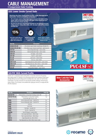 195CABLE MANAGEMENTTogether we GENERATE VALUEpvc-lsfdietzel univolt3 Compartment Dado TrunkingSLXL Lower Smoke Curved DadoPart No. DescriptionSLXL65/210 LSF 210 x 65mm Lower Smoke Curved Dado CAT6/6A/7/8SLXL65/210 LSF-LGL 210 x 65mm Lower Smoke Curved Dado - Light Grey LidSLIA LSF Internal Adjustable Angle - Lower SmokeSLOA LSF External Adjustable Angle - Lower SmokeSLFA LSF Flat Angle - Lower SmokeSLFT LSF Flat Tee - Lower SmokeSLC LSF Joint Cover - Lower SmokeSLE LSF End Cap - Lower SmokeSLB1-A LSF Single Adjustable box 30mm-50mm - Lower SmokeSLB2-A LSF Twin Adjustable box 30mm-50mm - Lower SmokeSLCR LSF Cable Retainer - Lower SmokeSLA LSF Conduit/Mini Adaptor - Lower SmokeMarking the Next Generation in PVC Cable Management Solutions. Enhanced Safety as Standard %u2022 PVC- LSF (lower smoke & fume) high impact 3 compartment dado trunking system, with an innovative formula, will reduce smoke emission by up to 65% in the first 4 minutes of a fire.%u2022 The SLXL-LSF will meet and exceed all standards for the following structured cabling solutions: CAT5E, CAT6, CAT6A, CAT7, the latest CAT8 (UTP & shielded) and OM3 fibre.SLXL lower smoke off ers an ignition point up to 15% higher than standard PVCHalogens are releasedat a considerablyslower rateSmoke release is reduced by up to 65% in the fi rst 4 minutes of a fi reSLIA SLB1-A SLFASLR-PVC With Curved ProfilePart No. Description Pack QtySLR 50/170 170mmx50mm 3 Comp Dado Trunking Curved -3M 1pcSLR 50/170 LGL 170mmx50mm 3 Comp Dado Trunking Curved with light Grey Lid - 3M%u00a01pcSLRIA Internal Adjustable Angle - Cat6/6A/7/8 1pcSLREA External Adjustable Angle - Cat6/6A/7/8 1pc%u00a0SLREC End Cap 1pcSLRJC Joint Cover 1pcSLRFA Flat Angle - Cat6/6A/7/8 1pcSLRFT Flat Tee - Cat6/6A/7/8 1pcSLRTOA Take Off Adaptor Conduit & Mini 1pcSLB 1 One Gang Outlet Boxes - 28mm Deep 1pcSLB 2 Twin Gang Outlet Boxes - 28mm Deep 1pcSLB1-A Single Adjustable box 30mm-50mm 1pcSLB2-A%u00a0 Twin Adjustable box 30mm-50mm-lower smoke 1pc15%Univolt%u2019s SLR- 3 compartment dado trunking off ers an innovative solution for the growing data-cabling market. At 170x50mm, the curved design allows for the installation of both power and high-density structured cabling systems including Cat5e, Cat6, Cat6A, Cat7 and the latest Cat8 solutions. Our latest accessories are now injection moulded, allowing a minimum bend radius of 50mm. The SLR dado is also available with a light grey centre lid, to comply with DDA (Part M) compliance.New Cat6/6A/7&8 Accessories