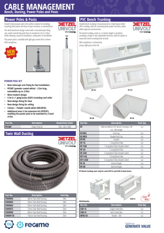 196CABLE MANAGEMENTTogether we GENERATE VALUEPower Poles & Posts%u2022 New telescopic arm fixing for fast installation.%u2022 PP2WT (powder coated white) - 3.5m long, extendable up to 3.95m%u2022 More modern design%u2022 C/w 6 x 1 gang boxes (SLB1) including roof collar%u2022 New design fixing for base%u2022 New design fixing for ceiling%u2022 Colours %u2013 Powder coated white (RAL9010).%u2022 Additional extra 2.5m extension kit (PP2EXT), enabling the power pole to be extended to a total of 6mPart No. Description Dimensions (mm)PP2WT Power Pole Kit 104 x 106 x 3500PVC Bench TrunkingPart No. Description Pack QtyBT 100mmx100mm PVC Bench Trunking C/W Lid - 3M Length1pcBT/BES End Cap 1pcBT/BED Double End Cap 1pcBT/BC Coupler 1pcBT-1G 1 Gang Bench Box 1pcBT-1GD 1 Gang Bench Box Double Sided 1pcBT-2G 2 Gang Bench Box 1pcBT-2GD 2 Gang Bench Box Double Sided 1pcBT1+2G 3 Gang Bench Box 1pcBT1+2GD 3 Gang Bench Box Double Sided 1pcBT-IB Internal Angle 1pcBT-EB External Angle 1pcPart No. Description Pack QtySLB1-A Single Socket Box 1pcSLB2-A Twin Socket Box 1pcMTW 50 Divider - 3M 1pcAccessoriesSLB1-A SLB2-ABT-1G BT-2GBT-EB BT-IBPOWER POLE KITBench, Ducting, Power Poles and PostsNEW RANGEBT Bench trunking must only be used SLB1-A and SLB2-A back boxes.Univolt%u2019s latest power pole is the perfect solution for buildings requiring both power and data in open locations, or workstations.The sleek aluminum design comes with a new telescopic fi xing arm, which extends the pole from its standard 3.5m to 3.95m, whilst allowing a quick fi x installation, saving time on installation.The power pole is available with light grey centre lid to achieve DDA compliance.Univolt bench trunking is manufactured in a high impact white uPVC trunking, ideal for containing both power and data cables within vigorous environments.The bench trunking comes in a 3-meter length as standard, accepting a single or twin adjustable back box, with the option to mount the bench trunking back-to-back.DDA compliance is achieved by using a light grey centre lid.BT-2GTwin Wall DuctingPart No. Description Pack QtyFXKVR40 40mm Twin Wall Ducting 50mFXKVR50 50mm Twin Wall Ducting 50mFXKVR63 63mm Twin Wall Ducting 50mFXKVR75 75mm Twin Wall Ducting 50mFXKVR90 90mm Twin Wall Ducting 50mFXKVR110 110mm Twin Wall Ducting 50m