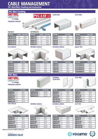 199CABLE MANAGEMENTTogether we GENERATE VALUEFLAT ANGLES INTERNAL ANGLES EXTERNAL ANGLES EQUAL TEESFLAT ANGLES INTERNAL ANGLES EXTERNAL ANGLES FLAT TEESEXTERNAL COUPLINGSSTOP ENDSTRUNKING LENGTHSPVC Mini/Maxi Trunking and AccessoriesPVC Mini TrunkingPart No. Length Size (mm)MIK16/16 LSF 3.0 16x16MIK16/25 LSF 3.0 25x16MIK16/40 LSF 3.0 38x16MIK25/40 LSF 3.0 38x25MIK40/40 LSF 3.0 38x38StandardPart No. Length Size (mm)MIKA1 LSF 3.0 16x16MIKA2 LSF 3.0 25x16MIKA3 LSF 3.0 38x16MIKA4 LSF 3.0 38x25MIKA5 LSF 3.0 38x38Self AdhesiveCOUPLINGSPart No. Size (mm)SK16/16 16x16SK16/25 25x16SK16/40 38x16SK25/40 38x25SK40/40 38x38STOP ENDSPart No. Size (mm)SE/16/16 16x16SE/16/25 25x16SE/16/40 38x16SE/25/40 38x25SE/40/40 38x38Part No. Size (mm)SAE16/16 16x16SAE16/25 25x16SAE16/40 38x16SAE25/40 38x25SAE40/40 38x38Part No. Size (mm)ST16/16X16/16 16x16ST16/25X16/25 25x16ST16/40X16/40 38x16ST25/40X25/40 38x25ST40/40X40/40 38x38Part No. Size (mm)SFW16/16 16x16SFW16/25 25x16SFW16/40 38x16SFW25/40 38x25SFW40/40 38x38Part No. Size (mm)SIE16/16 16x16SIE16/25 25x16SIE16/40 38x16SIE25/40 38x25SIE40/40 38x38PVC Maxi TRUNKING LENGTHSPart No. Size (mm)MAK50/50 50x50MAK50/75 50x75MAK50/100 50x100MAK75/75 75x75MAK75/100 75x100MAK75/150 75x150Part No. Size (mm)MIC50/50 50x50MIC50/75 50x75MIC50/100 50x100MIC75/75 75x75MIC100/100 100x100MIC150/150 150x150Part No. Size (mm)ME50/50 50x50ME50/75 50x75ME50/100 50x100ME75/75 75x75ME100/100 100x100ME150/150 150x150Part No. Size (mm)MFW50/50 50x50MFW50/75 50x75MFW50/100 50x100MFW75/75 75x75MFW100/100 100x100MFW150/150 150x150Part No. Size (mm)MIE50/50 50x50MIE50/75 50x75MIE50/100 50x100MIE75/75 75x75MIE100/100 100x100MIE150/150 150x150Part No. Size (mm)MAE50/50 50x50MAE50/75 50x75MAE50/100 50x100MAE75/75 75x75MAE100/100 100x100MAE150/150 150x150Part No. Size (mm)MFT50/50 50x50MFT50/75 50x75MFT50/100 50x100MFT75/75 75x75MFT100/100 100x100MFT150/150 150x150Part No. Size (mm)MAK100/100 100x100MAK100/150 100x150MAK150/150 150x150Additional accessories available in further sizes