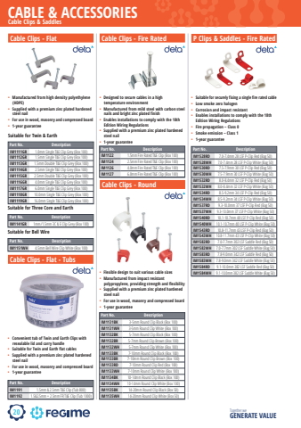 20CABLE & ACCESSORIESTogether we GENERATE VALUETrade TubdetaCable Clips & SaddlesCable Clips - Flat Cable Clips - Fire RatedPart No. DescriptionIM1111GR 1.0mm Single T&E Clip Grey (Box 100)IM1112GR 1.5mm Single T&E Clip Grey (Box 100)IM1113GR 1.5mm Double T&E Clip Grey (Box 100)IM1114GR 2.5mm Single T&E Clip Grey (Box 100)IM1115GR 2.5mm Double T&E Clip Grey (Box 100)IM1116GR 4.0mm Single T&E Clip Grey (Box 100)IM1117GR 6.0mm Single T&E Clip Grey (Box 100)IM1118GR 10.0mm Single T&E Clip Grey (Box 100)IM1119GR 16.0mm Single T&E Clip Grey (Box 100)%u2022 Manufactured from high density polyethylene (HDPE)%u2022 Supplied with a premium zinc plated hardened steel nail%u2022 For use in wood, masonry and compressed board%u2022 1-year guaranteeCable Clips - Flat - TubsPart No. DescriptionIM1191 1.5mm & 2.5mm T&E Clip (Tub 800)IM1192 1.5&2.5mm + 2.5mm FR T&E Clip (Tub 1000)%u2022 Convenient tub of Twin and Earth Clips with resealable lid and carry handle%u2022 Suitable for Twin and Earth flat cables%u2022 Supplied with a premium zinc plated hardened steel nail%u2022 For use in wood, masonry and compressed board%u2022 1-year guaranteeSuitable for Twin & EarthPart No. DescriptionIM1141GR 1mm/1.5mm 3C & E Clip Grey (Box 100)Suitable for Three Core and EarthPart No. DescriptionIM1151WH 4.5mm Bell Wire Clip White (Box 100)Suitable for Bell WirePart No. DescriptionIM1122 1.5mm Fire Rated T&E Clip (Box 100)IM1124 2.5mm Fire Rated T&E Clip (Box 100)IM1126 4.0mm Fire Rated T&E Clip (Box 100)IM1127 6.0mm Fire Rated T&E Clip (Box 100)%u2022 Designed to secure cables in a high temperature environment%u2022 Manufactured from mild steel with carbon steel nails and bright zinc plated finish%u2022 Enables installations to comply with the 18th Edition Wiring Regulations%u2022 Supplied with a premium zinc plated hardened steel nail%u2022 1-year guaranteeCable Clips - RoundPart No. DescriptionIM1131BK 3-5mm Round Clip Black (Box 100)IM1131WH 3-5mm Round Clip White (Box 100)IM1132BK 5-7mm Round Clip Black (Box 100)IM1132BR 5-7mm Round Clip Brown (Box 100)IM1132WH 5-7mm Round Clip White (Box 100)IM1133BK 7-10mm Round Clip Black (Box 100)IM1133BR 7-10mm Round Clip Brown (Box 100)IM1133RD 7-10mm Round Clip Red (Box 100)IM1133WH 7-10mm Round Clip White (Box 100)IM1134BK 10-14mm Round Clip Black (Box 100)IM1134WH 10-14mm Round Clip White (Box 100)IM1135BK 14-20mm Round Clip Black (Box 50)IM1135WH 14-20mm Round Clip White (Box 50)%u2022 Flexible design to suit various cable sizes%u2022 Manufactured from impact resistant polypropylene, providing strength and flexibility%u2022 Supplied with a premium zinc plated hardened steel nail%u2022 For use in wood, masonry and compressed board%u2022 1-year guaranteeP Clips & Saddles - Fire RatedPart No. DescriptionIM1528RD 7.0-7.4mm 28 LSF P-Clip Red (Bag 50)IM1528WH 7.0-7.4mm 28 LSF P-Clip White (Bag 50)IM1530RD 7.5-7.9mm 30 LSF P-Clip Red (Bag 50)IM1530WH 7.5-7.9mm 30 LSF P-Clip White (Bag 50)IM1532RD 8.0-8.4mm 32 LSF P-Clip Red (Bag 50)IM1532WH 8.0-8.4mm 32 LSF P-Clip White (Bag 50)IM1534RD 8.5-9.2mm 34 LSF P-Clip Red (Bag 50)IM1534WH 8.5-9.2mm 34 LSF P-Clip White (Bag 50)IM1537RD 9.3-10.0mm 37 LSF P-Clip Red (Bag 50)IM1537WH 9.3-10.0mm 37 LSF P-Clip White (Bag 50)IM1540RD 10.1-10.7mm 40 LSF P-Clip Red (Bag 50)IM1540WH 10.1-10.7mm 40 LSF P-Clip White (Bag 50)IM1543RD 10.8-11.7mm 43 LSF P-Clip Red (Bag 50)IM1543WH 10.8-11.7mm 43 LSF P-Clip White (Bag 50)IM1582RD 7.0-7.7mm 302 LSF Saddle Red (Bag 50)IM1582WH 7.0-7.7mm 302 LSF Saddle White (Bag 50)IM1583RD 7.8-9.0mm 342 LSF Saddle Red (Bag 50)IM1583WH 7.8-9.0mm 342 LSF Saddle White (Bag 50)IM1584RD 9.1-10.0mm 382 LSF Saddle Red (Bag 50)IM1584WH 9.1-10.0mm 382 LSF Saddle White (Bag 50)%u2022 Suitable for securely fixing a single fire rated cable%u2022 Low smoke zero halogen%u2022 Corrosion and impact resistant%u2022 Enables installations to comply with the 18th Edition Wiring Regulations%u2022 Fire propagation %u2013 Class 0%u2022 Smoke emission %u2013 Class 1%u2022 1-year guarantee