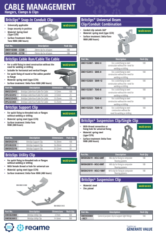 202CABLE MANAGEMENTTogether we GENERATE VALUEHangers, Clamps & ClipsBritclips%u00ae Universal BeamClip/Conduit Combination%u2022 Conduit clip swivels 360%u00b0%u2022 Material: spring steel (type CS70)%u2022 Surface treatment: Delta-Tone 9000 (480 hours)Part No. Description Pack QtyEM51132007 - 50H2-4 For a solid fi xing to steel construction without the need for welding or drilling100EM51132013 - 50H5-8 For a solid fi xing to steel construction without the need for welding or drilling100EM51132020 - 50H9-12 For a solid fi xing to steel construction without the need for welding or drilling100EM51132507 - 75H5-8 For a solid fi xing to steel construction without the need for welding or drilling100EM51132513 - 75H5-8 For a solid fi xing to steel construction without the need for welding or drilling100EM51132520 - 75H9-12 For a solid fi xing to steel construction without the need for welding or drilling100Britclips%u00ae Suspension Clip %u2022 Material: steel%u2022 Zinc platedPart No. Description Pack QtyEM59030000 - HSC1 General purpose clip to support light fi ttings 100Britclips%u00ae Suspension Clip/Single Clip%u2022 With thread connection or fixing hole for universal fixing%u2022 Material: spring steel (type CS70)%u2022 Surface treatment: Delta-Tone 9000 (480 hours)Part No. Description Pack QtyEM58420619 - HOL3-6MT M6 clip for fi xing to composite fl ooring systems100EM58420819 - HOL3-8MT M8 clip for fi xing to composite fl ooring systems100EM58421019 - HOL3-10MT M10 clip for fi xing to composite fl ooring systems100Britclips Cable Run/Cable Tie Cable%u2022 For a solid fixing to steel construction without the need for welding or drilling%u2022 Suitable for horizontal and vertical flanges%u2022 For quick fixing of round or flat cables parallel to flange%u2022 Material: spring steel (type CS70)%u2022 Surface treatment: Delta-Tone 9000 (480 hours)Part No. Description Dimensions Pack QtyEM52323412 Britclips Cable Run/Cable Tie Cable 3-12mm 100EP52323412 Britclips Cable Run/Cable Tie Cable 3-12mm 25EM52323425 Britclips Cable Run/Cable Tie Cable 12-25mm 100EP52323425 Britclips Cable Run/Cable Tie Cable 12-25mm 25Britclips Support Clip%u2022 For quick fixing to threaded rods or flanges without welding or drilling%u2022 Material: spring steel (type CS70)%u2022 Surface treatment: Delta-Tone 9000 (480 hours)Part No. Description Dimensions Pack QtyEM55922510 Britclips Support Clip 16-20mm 100EP55922510 Britclips Support Clip 16-20mm 25EM55923210 Britclips Support Clip 25-32mm 50Britclips Utility Clip%u2022 For quick fixing to threaded rods or flanges without welding or drilling%u2022 With female thread or hole for universal use%u2022 Material: spring steel (type CS70)%u2022 Surface treatment: Delta-Tone 9000 (480 hours)Part No. Description Dimensions Pack QtyEM55020008 Britclips Utility Clip 3-7mm 100EM55020012 Britclips Utility Clip 9-14mm 100Britclips%u00ae Snap-In Conduit Clip %u2022 Universally applicable%u2022 Snaps securely in position %u2022 Material: Spring Steel (Type CS70) %u2022 Surface Treatment: DeltaTone 9000 (480 hours) Part No. Description Pack QtyEM59142000 - CC500 20mm clip for all pipes 100EM59142500 - CC750 25mm clip for all pipes 100