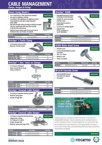 203CABLE MANAGEMENTTogether we GENERATE VALUEClamps, Hangers & FixingsW-LX-N Concrete Screw%u2022 Internal M8/M10 thread %u2022 Very high load capacity%u2022 Zinc platedPart No. Description62433304 6 x 35mm High performance concrete screw62433305 6 x 55mm High performance concrete screwThe value of smartFor fast and reliable %u000c xing, choose concrete screws Walraven Concrete ScrewsETA approved range for guaranteed qualityConcrete screws are a convenient, versatile and value for money choice for everyday M&E installations. They are commonly used for securing channel to a surface or dropping rod from in overhead applications. As a screw anchor, they are incredibly easy to install. Brands that are ETA approved offer re ratings so can be used in escape routes, and documented performance values so you know exactly what you are getting. Britclips%u00ae RSWBPart No. Description59491016 10-16%u201d (25-40cm) Rapid Sliding Wall Bracket59491624 16-24%u201d (40-60cm) Rapid Sliding Wall Bracket%u2022 Extendable bracket for faster mounting of electrical boxes%u2022 Suitable for use in stud walls and floor joists %u2022 Can be fixed to wood or metal joists %u2022 Can be set at multiple depths%u2022 Expands from 10-16%u201d (25-40cm) or 16-24%u201d (40-60cm)RSWB Wafer Head Screw%u2022 Self-drill screw%u2022 For easy fixing RSWB into metal stud work%u2022 Size: 4.2 x 13mm%u2022 Material: steel%u2022 Finish: zinc platedPart No. Description Dimensions Pack Qty6179413 RSWB Wafer Head Screw 4.2x13mm 500Beam Clamp Model C %u2022 For a solid fixing to steel construction without the need for welding or drilling%u2022 According to VdS-regulations an additional safety strap should be used when supporting pipes above DN65%u2022 Bolt with hexagon head according to DIN 933 strength class 8.8, screw point with cup ring according to EN ISO 4753 and lock nut%u2022 Material: beam clamp made of cast iron; bolt of hardened steel, nut of steel, zinc platedPart No. Description Pack QtyEP6003910 For fi xing to fl anges 50Britclips%u00ae Z Purlin Clamp %u2022 For threaded rod up to M10%u2022 Material: steel Zinc platedPart No. Description Pack QtyEP57431185 - ZHD2 For fi xing to vertical fl anges 25EM57431185 - ZHD2 For fi xing to vertical fl anges 100Britclips%u00ae T Bar/ Twist on Clamps %u2022 For fixing to ceiling grid%u2022 With stud bolt M6 for fixing clamp, conduit etc Part No. Description Pack QtyEM56521603 - AC15 M6 x 16mm Twist on fi xing 100EM56521604 - AC25 M6 x 16mm Twist on fi xing 100Britclips%u00ae Dovetail Cable Hanger %u2022 For fixing to composite flooring systems%u2022 Material: Spring Steel%u2022 Rotates through 360%u00b0Part No. Description Pack QtyEM58220000 HOL1 Simple push in fi xing 100Britclips%u00ae Dovetail Cable Hanger%u2022 For fixing to composite flooring systems%u2022 Simple push in fixing%u2022 For fixing up to 4 cables%u2022 Rotates through 360%u00b0%u2022 Material: spring steel (type CS70)Part No. Description Pack QtyEM58221216 %u2013 HOL2-1 For composite fl ooring systems 100EM58221222 %u2013 HOL2-2 For composite fl ooring systems 100Concrete screws are a convenient, versatile and value for money choice for everyday M&E installations. They are commonly used for securing channel to a surface or dropping rod from in overhead applications. As a screw anchor, they are incredibly easy to install. Brands that are ETA approved off er fi re ratings so can be used in escape routes, and documented performance values so you know exactly what you are getting.The value of smartFor fast and reliable %u000c xing, choose concrete screws Walraven Concrete ScrewsETA approved range for guaranteed qualityConcrete screws are a convenient, versatile and value for money choice for everyday M&E installations. They are commonly used for securing channel to a surface or dropping rod from in overhead applications. As a screw anchor, they are incredibly easy to install. Brands that are ETA approved offer re ratings so can be used in escape routes, and documented performance values so you know exactly what you are getting.