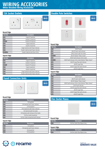 206WIRING ACCESSORIESTogether we GENERATE VALUEWhite Moulded Wiring Accessoriesbg british general13A Socket OutletsPart No. Description821 Single SP Switched822 Double SP Switched822DP Double DP Switched823 Single Unswitched824 Double Unswitched825 Single Switched with Power Indicator826 Double Switched with Power Indicator822BELL Double Switched with Door ChimeRound EdgePart No. Description921 Single SP Switched922 Double SP Switched922DP Double DP Switched923 Single Unswitched924 Double Unswitched925 Single Switched with Power Indicator926 Double Switched with Power IndicatorSquare EdgeFused Connection UnitsPart No. Description850 13A Switched 852 13A Switched with Power Indicator854 13A Unswitched856 13A Unswitched with Power Indicator851 13A Switched with Flex Outlet853 13A Switched with Indicator & Flex Outlet855 13A Flex Outlet Unswitched857 13A Flex Outlet Unswitched with IndicatorRound EdgePart No. Description950 13A Switched 951 13A Switched with Power Indicator953 3A Unswitched952 13A UnswitchedSquare EdgeDouble Pole SwitchesPart No. Description830 20A DP Switch831 20A DP Switch with Indicator832 20A DP Switch with Flex Outlet832WH 20A DP Marked \833 20A DP with Indicator & Flex Outlet833WH 20A DP with Indicator & Flex Outlet Marked \872 45A DP Large Plate with Indicator873 45A DP Large Plate874 45A DP Single Plate with Indicator875 45A DP Single PlateRound EdgePart No. Description930 20A DP Switch931 20A DP Switch with Indicator932 20A DP Marked \933 20A DP with Indicator & Flex Outlet Marked \934 32A DP with Indicator972 45A DP Large Plate with Indicator973 45A DP Large Plate974 45A DP Single Plate with Indicator975 45A DP Single PlateSquare EdgeFlex Outlet PlatesPart No. Description858 25A Flex Outlet Plate Bottom EntryRound EdgePart No. Description954 25A Flex Outlet Plate Bottom EntrySquare Edge