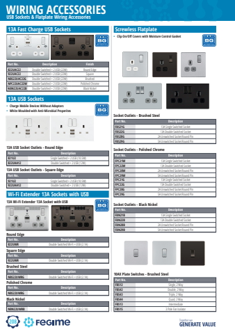208WIRING ACCESSORIESTogether we GENERATE VALUEUSB Sockets & Flatplate Wiring Accessories13A USB Sockets%u2022 Charge Mobile Devices Without Adaptors%u2022 White Moulded with Anti-Microbial ProperitesPart No. Description821U2 Single Switched + 2 USB (10.5W)822UAA12 Double Switched + 2 USB (12W)13A USB Socket Outlets - Round Edge13A USB Socket Outlets - Square EdgePart No. Description921U2 Single Switched + 2 USB (10.5W)922UAA12 Double Switched + 2 USB (12W)Wi-Fi Extender 13A Sockets with USB13A Fast Charge USB Sockets13A Wi-Fi Extender 13A Socket with USBPart No. Description822UWR Double Switched Wi-Fi + USB (2.1A)Round EdgePart No. Description922UWR Double Switched Wi-Fi + USB (2.1A)Square EdgePart No. DescriptionNBS22UWRG Double Switched Wi-Fi + USB (2.1A)Brushed SteelPart No. DescriptionNBS22UWRG Double Switched Wi-Fi + USB (2.1A)Polished ChromePart No. DescriptionNBN22UWRB Double Switched Wi-Fi + USB (2.1A)Black NickelScrewless Flatplate%u2022 Clip On/Off Covers with Moisture Control GasketPart No. Description Finish822UAC22 Double Switched + 2 USB (22W) Round Edge 922UAC22 Double Switched + 2 USB (22W) SquareNBS22UAC22G Double Switched + 2 USB (22W) BrushedNPC22UAC22W Double Switched + 2 USB (22W) Polished ChromeNBN22UAC22B Double Switched + 2 USB (22W) Black NickelPart No. DescriptionFBS21G 13A Single Switched SocketFBS22G 13A Double Switched SocketFBS28G 2A Unswitched Socket Round PinFBS29G 5A Unswitched Socket Round PinSocket Outlets - Brushed SteelPart No. DescriptionFPC21W 13A Single Switched SocketFPC22W 13A Double Switched SocketFPC28W 2A Unswitched Socket Round PinFPC29W 5A Unswitched Socket Round PinFPC21G 13A Single Switched SocketFPC22G 13A Double Switched SocketFPC28G 2A Unswitched Socket Round PinFPC29G 5A Unswitched Socket Round PinSocket Outlets - Polished ChromePart No. DescriptionFBN21B 13A Single Switched SocketFBN22B 13A Double Switched SocketFBN28B 2A Unswitched Socket Round PinFBN29B 5A Unswitched Socket Round PinSocket Outlets - Black NickelPart No. DescriptionFBS12 Single, 2 WayFBS42 Double, 2 WayFBS43 Triple, 2 WayFBS44 Quad, 2 WayFBS13 IntermediateFBS15 3 Pole Fan Isolator10AX Plate Switches - Brushed Steel