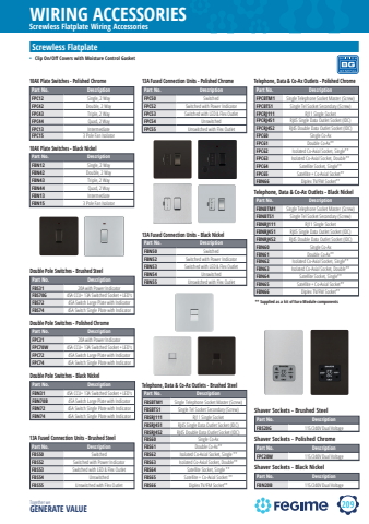 209WIRING ACCESSORIESTogether we GENERATE VALUEScrewless Flatplate Wiring AccessoriesScrewless Flatplate%u2022 Clip On/Off Covers with Moisture Control GasketPart No. DescriptionFBS31 20A with Power IndicatorFBS70G 45A CCU+ 13A Switched Socket + LED'sFBS72 45A Switch Large Plate with IndicatorFBS74 45A Switch Single Plate with IndicatorDouble Pole Switches - Brushed SteelPart No. DescriptionFPC31 20A with Power IndicatorFPC70W 45A CCU+ 13A Switched Socket + LED'sFPC72 45A Switch Large Plate with IndicatorFPC74 45A Switch Single Plate with IndicatorDouble Pole Switches - Polished ChromePart No. DescriptionFBN31 45A CCU+ 13A Switched Socket + LED'sFBN70B 45A Switch Large Plate with IndicatorFBN72 45A Switch Single Plate with IndicatorFBN74 45A Switch Single Plate with IndicatorDouble Pole Switches - Black NickelPart No. DescriptionFPC12 Single, 2 WayFPC42 Double, 2 WayFPC43 Triple, 2 WayFPC44 Quad, 2 WayFPC13 IntermediateFPC15 3 Pole Fan Isolator10AX Plate Switches - Polished ChromePart No. DescriptionFBN12 Single, 2 WayFBN42 Double, 2 WayFBN43 Triple, 2 WayFBN44 Quad, 2 WayFBN13 IntermediateFBN15 3 Pole Fan Isolator10AX Plate Switches - Black NickelPart No. DescriptionFBS50 SwitchedFBS52 Switched with Power IndicatorFBS53 Switched with LED & Flex OutletFBS54 UnswitchedFBS55 Unswitched with Flex Outlet13A Fused Connection Units - Brushed Steel13A Fused Connection Units - Polished Chrome13A Fused Connection Units - Black NickelPart No. DescriptionFPC50 SwitchedFPC52 Switched with Power IndicatorFPC53 Switched with LED & Flex OutletFPC54 UnswitchedFPC55 Unswitched with Flex OutletPart No. DescriptionFBN50 SwitchedFBN52 Switched with Power IndicatorFBN53 Switched with LED & Flex OutletFBN54 UnswitchedFBN55 Unswitched with Flex OutletPart No. DescriptionFBSBTM1 Single Telephone Socket Master (Screw)FBSBTS1 Single Tel Socket Secondary (Screw)FBSRJ111 RJ11 Single Socket FBSRJ451 RJ45 Single Data Outlet Socket (IDC)FBSRJ452 RJ45 Double Data Outlet Socket (IDC)FBS60 Single Co-AxFBS61 Double Co-Ax**FBS62 Isolated Co-Axial Socket, Single **FBS63 Isolated Co-Axial Socket, Double**FBS64 Satellite Socket, Single **FBS65 Satellite + Co-Axial Socket **FBS66 Diplex TV/FM Socket**Telephone, Data & Co-Ax Outlets - Brushed SteelPart No. DescriptionFPCBTM1 Single Telephone Socket Master (Screw)FPCBTS1 Single Tel Socket Secondary (Screw)FPCRJ111 RJ11 Single Socket FPCRJ451 RJ45 Single Data Outlet Socket (IDC)FPCRJ452 RJ45 Double Data Outlet Socket (IDC)FPC60 Single Co-AxFPC61 Double Co-Ax**FPC62 Isolated Co-Axial Socket, Single**FPC63 Isolated Co-Axial Socket, Double**FPC64 Satellite Socket, Single**FPC65 Satellite + Co-Axial Socket**FBN66 Diplex TV/FM Socket**Telephone, Data & Co-Ax Outlets - Polished ChromePart No. DescriptionFBNBTM1 Single Telephone Socket Master (Screw)FBNBTS1 Single Tel Socket Secondary (Screw)FBNRJ111 RJ11 Single Socket FBNRJ451 RJ45 Single Data Outlet Socket (IDC)FBNRJ452 RJ45 Double Data Outlet Socket (IDC)FBN60 Single Co-AxFBN61 Double Co-Ax**FBN62 Isolated Co-Axial Socket, Single**FBN63 Isolated Co-Axial Socket, Double**FBN64 Satellite Socket, Single**FBN65 Satellite + Co-Axial Socket**FBN66 Diplex TV/FM Socket**Telephone, Data & Co-Ax Outlets - Black Nickel** Supplied as a kit of Euro Module componentsPart No. DescriptionFBS20G 115/240V Dual VoltageShaver Sockets - Brushed SteelPart No. DescriptionFPC20W 115/240V Dual VoltageShaver Sockets - Polished ChromePart No. DescriptionFBN20B 115/240V Dual VoltageShaver Sockets - Black Nickel