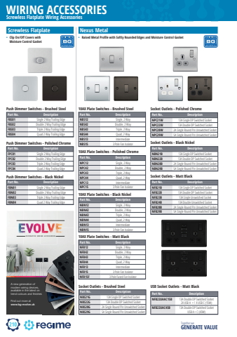 210WIRING ACCESSORIESTogether we GENERATE VALUEScrewless Flatplate Wiring AccessoriesScrewless Flatplate%u2022 Clip On/Off Covers with Moisture Control GasketPart No. DescriptionFBS81 Single 2 Way Trailing EdgeFBS82 Double 2 Way Trailing EdgeFBS83 Triple 2 Way Trailing EdgeFBS84 Quad 2 Way Trailing EdgePush Dimmer Switches - Brushed SteelPush Dimmer Switches - Polished ChromePush Dimmer Switches - Black NickelPart No. DescriptionFPC81 Single 2 Way Trailing EdgeFPC82 Double 2 Way Trailing EdgeFPC83 Triple 2 Way Trailing EdgeFPC84 Quad 2 Way Trailing EdgePart No. DescriptionFBN81 Single 2 Way Trailing EdgeFBN82 Double 2 Way Trailing EdgeFBN83 Triple 2 Way Trailing EdgeFBN84 Quad 2 Way Trailing EdgeDECORATIVE WIRING ACCESSORIESA new generation of modern wiring devices, available in the latest on trend colours and fi nishesFind out more at www.bg-evolve.ukNexus Metal%u2022 Raised Metal Profile with Softly Rounded Edges and Moisture Control GasketPart No. DescriptionNBS12 Single, 2 WayNBS42 Double, 2 WayNBS43 Triple, 2 WayNBS44 Quad, 2 WayNBS13 IntermediateNBS15 3 Pole Fan Isolator10AX Plate Switches - Brushed SteelPart No. DescriptionNPC12 Single, 2 WayNPC42 Double, 2 WayNPC43 Triple, 2 WayNPC44 Quad, 2 WayNPC13 IntermediateNPC15 3 Pole Fan Isolator10AX Plate Switches - Polished ChromePart No. DescriptionNBN12 Single, 2 WayNBN42 Double, 2 WayNBN43 Triple, 2 WayNBN44 Quad, 2 WayNBN13 IntermediateNBN15 3 Pole Fan IsolatorPart No. DescriptionNFB12 Single, 2 WayNFB42 Double, 2 WayNFB43 Triple, 2 WayNFB44 Quad, 2 WayNFB13 IntermediateNFB15 3 Pole Fan IsolatorNFB15F 3 Pole Fused Fan Isolator10AX Plate Switches - Black Nickel10AX Plate Switches - Matt BlackPart No. DescriptionNBS21G 13A Single DP Switched SocketNBS22G 13A Double DP Switched SocketNBS28G 2A Single Round Pin Unswitched SocketNBS29G 5A Single Round Pin Unswitched SocketSocket Outlets - Brushed SteelSocket Outlets - Polished ChromeSocket Outlets - Black NickelSocket Outlets - Matt BlackUSB Socket Outlets - Matt BlackPart No. DescriptionNPC21W 13A Single DP Switched SocketNPC22W 13A Double DP Switched SocketNPC28W 2A Single Round Pin Unswitched SocketNPC29W 5A Single Round Pin Unswitched SocketPart No. DescriptionNBN21B 13A Single DP Switched SocketNBN22B 13A Double DP Switched SocketNBN28B 2A Single Round Pin Unswitched SocketNBN29B 5A Single Round Pin Unswitched SocketPart No. DescriptionNFB21B 13A Single DP Switched SocketNFB22B 13A Double DP Switched SocketNFB23B 13A Single Unswitched SocketNFB24B 13A Double Unswitched SocketNFB28B 2A Single Round Pin Unswitched SocketNFB29B 5A Single Round Pin Unswitched SocketPart No. DescriptionNFB22UAAC15B 13A Double DP Switched Socket 2X USB A%u00a0 + 1 X USB C (15W)NFB22UAC45B 13A Double DP Switched Socket USB A + C (45W)