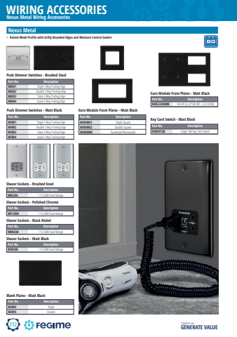 212WIRING ACCESSORIESTogether we GENERATE VALUENexus Metal Wiring AccessoriesNexus Metal%u2022 Raised Metal Profile with Softly Rounded Edges and Moisture Control GasketPart No. DescriptionNBS20G 115/240V Dual VoltageShaver Sockets - Brushed SteelPart No. DescriptionNPC20W 115/240V Dual VoltageShaver Sockets - Polished ChromePart No. DescriptionNBN20B 115/240V Dual VoltagePart No. DescriptionNFB20B 115/240V Dual VoltageShaver Sockets - Black NickelShaver Sockets - Matt BlackPart No. DescriptionNFB94 SingleNFB95 DoublePart No. DescriptionNFBEMS1 Single SquareNFBEMS2 Double SquareNFBEMR4 Quadruple RectangularPart No. DescriptionNFB222EM8B 13A DP 2G CP SW SKT + (2 X 4 EM)Part No. DescriptionNFBKYCSB Single 16A Key Card SwitchBlank Plates - Matt BlackEuro Module Front Plates - Matt BlackEuro Module Front Plates - Matt BlackKey Card Switch - Matt BlackPart No. DescriptionNBS81 Single 2 Way Trailing EdgeNBS82 Double 2 Way Trailing EdgeNBS83 Triple 2 Way Trailing EdgeNBS84 Quad 2 Way Trailing EdgePart No. DescriptionNFB81 Single 2 Way Trailing EdgeNFB82 Double 2 Way Trailing EdgeNFB83 Triple 2 Way Trailing EdgeNFB84 Quad 2 Way Trailing EdgePush Dimmer Switches - Brushed SteelPush Dimmer Switches - Matt Black