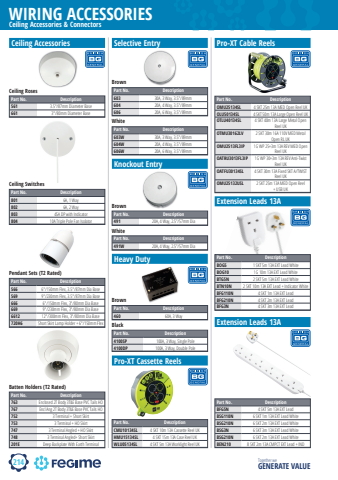 214WIRING ACCESSORIESTogether we GENERATE VALUECeiling Accessories & ConnectorsCeiling AccessoriesPart No. Description561 3.5\661 3\Ceiling RosesPart No. Description801 6A, 1 Way802 6A, 2 Way803 45A DP with Indicator804 10A Triple Pole Fan IsolatorCeiling SwitchesPart No. Description566 6\569 9\666 6\669 9\6612 12\720H6 Short Skirt Lamp Holder + 6\Pendant Sets (T2 Rated)Part No. Description763 Enclosed 2T Body 3T&E Base PVC Tails HO767 Encl Ang 2T Body 3T&E Base PVC Tails HO752 3 Terminal + Short Skirt753 3 Terminal + HO Skirt747 3 Terminal Angled + HO Skirt748 3 Terminal Angled+ Short Skirt201E Deep Backplate With Earth TerminalBatten Holders (T2 Rated)Selective EntryBrownPart No. Description603 30A, 3 Way, 3.5\604 20A, 4 Way, 3.5\606 20A, 6 Way, 3.5\WhitePart No. Description603W 30A, 3 Way, 3.5\604W 20A, 4 Way, 3.5\606W 20A, 6 Way, 3.5\Knockout EntryPart No. Description491 20A, 4 Way, 2.5%u201d/57mm DiaBrownPart No. Description491W 20A, 4 Way, 2.5%u201d/57mm DiaWhiteHeavy DutyPart No. Description460 60A, 3 WayBrownPart No. Description4100SP 100A, 3 Way, Single Pole4100DP 100A, 3 Way, Double PoleBlackPro-XT Cassette ReelsPart No. DescriptionCMU10134SL 4 SKT 10m 13A Cassette Reel UKHMU15134SL 4 SKT 15m 13A Case Reel UKWLU05134SL 4 SKT 5m 13A Worklight Reel UKPro-XT Cable ReelsPart No. DescriptionOMU25134SL 4 SKT 25m 13A MED Open Reel UKOLU50134SL 4 SKT 50m 13A Large Open Reel UKOTLU40134SL 4 SKT 40m 13A Large Metal Open Reel UKOTMU30162LV 2 SKT 30m 16A 110V MED Metal Open RL UKOMU2513FL3IP 1G WP 25+3m 13A REV MED Open Reel UKOATRU3013FL3IP 1G WP 30+3m 13A REV Anti-Twist Reel UKOATFU30134SL 4 SKT 30m 13A Fixed SKT A/TWIST Reel UKOMU25132USL 2 SKT 25m 13A MED Open Reel + USB UKExtension Leads 13APart No. DescriptionBOG5 1 SKT 5m 13A EXT Lead WhiteBOG10 1G 10m 13A EXT Lead WhiteBTG5N 2 SKT 5m 13A EXT Lead WhiteBTN10N 2 SKT 10m 13A EXT Lead + Indicator WhiteBFG110N 4 SKT 1m 13A EXT LeadBFG210N 4 SKT 2m 13A EXT LeadBFG3N 4 SKT 3m 13A EXT LeadExtension Leads 13APart No. DescriptionBFG5N 4 SKT 5m 13A EXT LeadBSG110N 6 SKT 1m 13A EXT Lead WhiteBSG210N 6 SKT 2m 13A EXT Lead WhiteBSG3N 6 SKT 3m 13A EXT Lead WhiteBSG210N 6 SKT 2m 13A EXT Lead WhiteBEN210 8 SKT 2m 13A CMPCT EXT Lead + IND