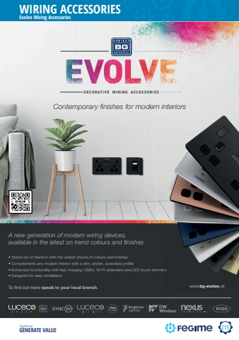 215WIRING ACCESSORIESTogether we GENERATE VALUEDECORATIVE WIRING ACCESSORIESContemporary finishes for modern interiorsA new generation of modern wiring devices, available in the latest on trend colours and finishes%u2022 Stand out or blend in with the widest choice of colours and finishes%u2022 Complements any modern interior with a slim, stylish, screwless profile%u2022 Enhanced functionality with fast charging USB%u2019s, Wi-Fi extenders and LED touch dimmers%u2022 Designed for easy installationTo find out more speak to your local branch.Contemporary finishes for modern interiors%u2022 Enhanced functionality with fast charging USB%u2019s, Wi-Fi extenders and LED touch dimmersEvolve Wiring Accessorieswww.bg-evolve.uk