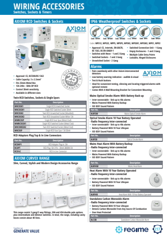 217WIRING ACCESSORIESTogether we GENERATE VALUE%u2022 Pairs seamlessly with other Axiom interconnected detectors%u2022 Low battery warning indication - audible & visual%u2022 Test & Hush buttons%u2022 Ideal for convenient testing, silencing and locating triggered alarms with optional remote%u2022 Comes With A Wall Mounting Bracket For Convenient Mountingced axiomSwitches, Sockets & TimersAXIOM RCD Switches & SocketsCodes: WPS12, WPS22, WPPS, WPSPS, WPSK2, WPSSK1, WPSSK2, WPE1, WPE2IP66 Weatherproof Switches & Sockets%u2022 Approval: CE, Intertek, EN 60670, BS 1363, BS EN 60669-1%u2022 Switches with Neon - 1 and 2 Gang%u2022 Switched Sockets - 1 and 2 Gang%u2022 Unswitched Socket - 2 Gang%u2022 Switched Connection Unit - 1 Gang%u2022 Empty Enclosures - 1 and 2 Gang%u2022 Multiple Cable Entry Points%u2022 Lockable, Hinged EnclosuresAlarmsMains Optical Smoke Alarm With Battery Back upPart No. DescriptionALRFSM Mains Optical Smoke Alarm %u2022 Approval: CE, BS7288/BS 1363%u2022 Cable Capacity: 3 x 2.5mm2%u2022 Fits 25mm Metal Box%u2022 13A 240v - 50Hz DP RCD%u2022 Control 30mA sensitivity%u2022 Available in different sizesPart No. DescriptionWRCDSK1 Single RCD Unswitched SocketWRCDSSK1 Single RCD Switched Socket 30mAWRCDSK2 Twin RCD Unswitched Socket (Moulded)WRCDSSK2 Twin RCD Unswitched Socket White 13AWMRCDSP Single RCD Fuse Spur (Metal Clad)WMRCDSSK1 Single RCD Switched Socket (Metal Clad)WRCDMSSK2 Twin RCD Switched Socket (Metal Clad)WRCDSP Single RCD Fuse Spur 13A 30mATwin RCD Switches, Sockets & Single SpursPart No. DescriptionRCDAP1 RCD Adaptor Plug-In 13ARCDPT RCD Plug 13A 3 Pin - 30mA 3000W ClARCDILC RCD In Line ConnectorRCD Adaptors Plug Top & In Line ConnectorsAXIOM CURVEX RANGESlim, Curved, Stylish and Modern Design Accessories RangeThis range consist 3 gang/2 way fi ttings, 20A and 45A double pole options plus intermediate and dimmer switches. In total, the range, including cavity boxes consist about 48 lines.%u2022 Inter-connectable - link up to 40x alarms%u2022 Mains Powered With Battery Backup%u2022 ISO 8201 Sound PatternOptical Smoke Alarm 10 Year Battery Operated - Radio frequency inter-connectedPart No. DescriptionALRFSB Optical Smoke Alarm%u2022 Inter-connectable - link up to 40x alarms%u2022 Battery Powered With 10 Year Lifespan%u2022 ISO 8201 Sound PatternMains Heat Alarm With Battery Backup - Radio frequency inter-connectedPart No. DescriptionALRFHM Mains Heat Alarm%u2022 Inter-connectable - link up to 40x alarms%u2022 Mains Powered With Battery Backup%u2022 ISO 8201 Sound PatternHeat Alarm With 10 Year Battery Operated - Radio frequency inter-connectedPart No. DescriptionALRFHB Heat Alarm With 10 Year Battery Operated%u2022 Inter-connectable - link up to 40x alarms%u2022 Battery Powered With 10 Year Lifespan%u2022 ISO 8201 Sound PatternStandalone Carbon Monoxide Alarm - Radio frequency inter-connectedPart No. DescriptionALCOB Standalone Carbon Monoxide Alarm%u2022 Battery Powered With 10 Year Lifespan%u2022 Detects Carbon Monoxide From Any Source Of Combustion%u2022 Over Heat Protected