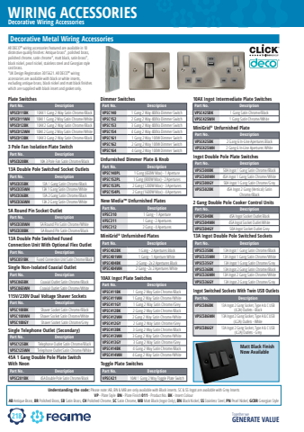 218WIRING ACCESSORIESTogether we GENERATE VALUEDecorative Wiring AccessoriesUnderstanding the code: Please note: AB, BN & MB are only available with Black inserts. SC & SS Ingot are available with Grey InsertsVP - Plate Style BN - Plate Finish 011 - Product No. BK - Insert Colour AB Antique Brass, BR Polished Brass, SB Satin Brass, CH Polished Chrome, SC Satin Chrome, MB Matt Black (Ingot Only), BN Black Nickel, SS Stainless Steel, PN Pearl Nickel, GCBR Georgian StyleDecorative Metal Wiring AccessoriesPart No. DescriptionVPSC011BK 10AX 1 Gang 2 Way Satin Chrome/BlackVPSC011WH 10AX 1 Gang 2 Way Satin Chrome/WhiteVPSC012BK 10AX 2 Gang 2 Way Satin Chrome/BlackVPSC012WH 10AX 2 Gang 2 Way Satin Chrome/WhiteVPSC013BK 10AX 3 Gang 2 Way Satin Chrome/BlackPlate SwitchesMatt Black Finish Now AvailablePart No. DescriptionVPSC020BK 10A 3 Pole Fan Satin Chrome/Black3 Pole Fan Isolation Plate SwitchPart No. DescriptionVPSC035BK 13A 1 Gang Satin Chrome/BlackVPSC035WH 13A 1 Gang Satin Chrome/WhiteVPSC036BK 13A 2 Gang Satin Chrome/BlackVPSC036WH 13A 2 Gang Satin Chrome/White13A Double Pole Switched Socket OutletsPart No. DescriptionVPSC038WH 5A Round Pin Satin Chrome/WhiteVPSC038BK 5A Round Pin Satin Chrome/Black5A Round Pin Socket OutletPart No. DescriptionVPSC051BK Fused Connection Unit Satin Chrome/Black13A Double Pole Switched Fused Connection Unit With Optional Flex OutletPart No. DescriptionVPSC065BK Coaxial Outlet Satin Chrome/BlackVPSC065WH Coaxial Outlet Satin Chrome/WhiteSingle Non-Isolated Coaxial OutletPart No. DescriptionVPSC100BK Shaver Socket Satin Chrome/BlackVPSC100WH Shaver Socket Satin Chrome/WhiteVPSC100GY Shaver Socket Satin Chrome/Grey115V/230V Dual Voltage Shaver SocketsPart No. DescriptionVPSC125BK Telephone Outlet Satin Chrome/BlackVPSC125WH Telephone Outlet Satin Chrome/WhiteSingle Telephone Outlet (Secondary)Part No. DescriptionVPSC140 1 Gang 2 Way 400Va Dimmer SwitchVPSC152 2 Gang 2 Way 400Va Dimmer SwitchVPSC153 3 Gang 2 Way 400Va Dimmer SwitchVPSC154 4 Gang 2 Way 400Va Dimmer SwitchVPSC161 1 Gang 2 Way 100W Dimmer SwitchVPSC162 2 Gang 2 Way 100W Dimmer SwitchVPSC164 4 Gang 2 Way 100W Dimmer SwitchDimmer SwitchesPart No. DescriptionVPSC140PL 1 Gang (650W Max) - 1 ApertureVPSC152PL 1 Gang (800W Max) - 2 AperturesVPSC153PL 2 Gang (1200W Max) - 3 AperturesVPSC154PL 2 Gang (1600W Max) - 4 AperturesUnfurnished Dimmer Plate & KnobPart No. DescriptionVPSC201BK 45A Double Pole Satin Chrome/Black45A 1 Gang Double Pole Plate Switch With NeonPart No. DescriptionVPSC310 1 Gang - 1 ApertureVPSC311 1 Gang - 2 AperturesVPSC312 2 Gang - 4 AperturesNew Media%u2122 Unfurnished PlatesPart No. DescriptionVPSC402BK 1 Gang - 2 Apertures BlackVPSC401WH 1 Gang - 1 Aperture WhiteVPSC404BK 2 Gang - 2x 2 Apertures BlackVPSC404WH 2 Gang - 2x 2 Apertures WhiteMiniGrid%u00ae Unfurnished PlatesPart No. DescriptionVPSC411BK 1 Gang 2 Way Satin Chrome/BlackVPSC411WH 1 Gang 2 Way Satin Chrome/WhiteVPSC411GY 1 Gang 2 Way Satin Chrome/GreyVPSC412BK 2 Gang 2 Way Satin Chrome/BlackVPSC412WH 2 Gang 2 Way Satin Chrome/WhiteVPSC412GY 2 Gang 2 Way Satin Chrome/GreyVPSC413BK 3 Gang 2 Way Satin Chrome/BlackVPSC413WH 3 Gang 2 Way Satin Chrome/WhiteVPSC413GY 3 Gang 2 Way Satin Chrome/GreyVPSC414BK 4 Gang 2 Way Satin Chrome/BlackVPSC414WH 4 Gang 2 Way Satin Chrome/White10AX Ingot Plate SwitchesPart No. DescriptionVPSC421 10AX 1 Gang 2 Way Toggle Plate SwitchToggle Plate SwitchesPart No. DescriptionVPSC425BK 1 Gang Satin Chrome/BlackVPSC425WH 1 Gang Satin Chrome/White10AX Ingot Intermediate Plate SwitchesPart No. DescriptionVPSC425BK 2 Gang 6 In-Line Apertures BlackVPSC425WH 2 Gang 6 In-Line Apertures WhiteMiniGrid%u00ae Unfurnished PlatePart No. DescriptionVPSC500BK 50A Ingot 1 Gang Satin Chrome/BlackVPSC500WH 45A Ingot 1 Gang Satin Chrome/WhiteVPSC500GY 50A Ingot 1 Gang Satin Chrome/GreyVPSC502BK 45A Ingot 2 Gang (Vertical) Satin Chrome/BlackIngot Double Pole Plate SwitchesPart No. DescriptionVPSC504BK 45A Ingot Socket Outlet BlackVPSC504WH 45A Ingot Socket Outlet WhiteVPSC504GY 50A Ingot Socket Outlet Grey2 Gang Double Pole Cooker Control UnitsPart No. DescriptionVPSC535BK 13A Ingot 1 Gang Satin Chrome/BlackVPSC535WH 13A Ingot 1 Gang Satin Chrome/WhiteVPSC535GY 13A Ingot 1 Gang Satin Chrome/GreyVPSC536BK 13A Ingot 2 Gang Satin Chrome/BlackVPSC536WH 13A Ingot 2 Gang Satin Chrome/WhiteVPSC536GY 13A Ingot 2 Gang Satin Chrome/Grey13A Ingot Double Pole Switched SocketsIngot Switched Sockets With Twin USB OutletsAll DECO%u00ae wiring accessories featured are available in 10 distinctive quality fi nishes: Antique brass*, polished brass, polished chrome, satin chrome*, matt black, satin brass*, black nickel, pearl nickel, stainless steel and Georgian style cast brass. *UK Design Registration 3015621. All DECO%u00ae wiring accessories are available with black or white inserts, excluding antique brass, black nickel and matt black fi nishes which are supplied with black insert and gasket only.Part No. DescriptionVPSC586BK 13A Ingot 2 Gang Socket, Type A & C USB (4.2A) Outlets - BlackVPSC586WH 13A Ingot 2 Gang Socket, Type A & C USB (4.2A) Outlets - WhiteVPSC586GY 13A Ingot 2 Gang Socket, Type A & C USB (4.2A) Outlets - Grey
