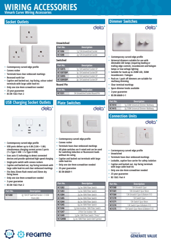 224WIRING ACCESSORIESTogether we GENERATE VALUEdetaVimark Curve Wiring AccessoriesSocket OutletsPart No. DescriptionVC1206 1g 13A Unswitched SocketVC1208 2g 13A Unswitched Socket%u2022 Contemporary curved edge profile%u2022 Convex rocker%u2022 Terminals have clear embossed markings%u2022 Recessed earth bar%u2022 Captive and backed out, top facing, colour coded terminals with large cable lead-ins%u2022 Only one size 4mm screwdriver needed%u2022 25-year guarantee%u2022 BS EN 1363: Part 2Part No. DescriptionVC1207S 1g 13A Switched Socket SPVC1207SDP 1g 13A Switched Socket DPVC1209S 2g 13A Switched Socket SPVC1209SDP 2g 13A Switched Socket DPUSB Charging Socket OutletsPart No. DescriptionVC1288 2g 13A SP Switched Socket + 3 USB Ports (4A)%u2022 Contemporary curved edge profile%u2022 USB ports deliver up to 4.0A (3.0A + 1.0A) simultaneous charging current across 3 ports (1 x Type C USB + 2 x Type A USB)%u2022 Uses auto IC technology to detect connected devices and provide optimised high-speed charging%u2022 Single pole switch with convex rockers%u2022 Captive and backed out, top facing terminals with large cable lead-ins and clear embossed markings%u2022 Fits Deta 25mm flush metal and 35mm dry lining boxes%u2022 Only one size 4mm screwdriver needed%u2022 2-year guarantee%u2022 BS EN 1363: Part 2Part No. DescriptionVC1331 5A Unswitched Socket Round PinPlate SwitchesPart No. DescriptionVC1202 1g 1w 10AX Plate SwitchVC1203 1g 2w 10AX Plate SwitchVC1204 2g 2w 10AX Plate SwitchVC1205 3g 2w 10AX Plate SwitchVC1244 4g 2w 10AX Plate SwitchVC1245 6g 2w 10AX Plate SwitchVC1246 1g Intermediate 10AX Plate SwitchVC1247 3 Pole Fan Isolator 10AVC1249 1g 2w 10AX Plate Switch \VC1249B 1g 2w 10AX Plate Switch Bell Symbol%u2022 Contemporary curved edge profile%u2022 Convex rocker%u2022 Terminals have clear embossed markings%u2022 All plate switches are X-rated and can be used for switching inductive or fluorescent loads without de-rating%u2022 Captive and backed out terminals with large cable lead-ins%u2022 Only one size 4mm screwdriver needed%u2022 25-year guarantee%u2022 BS EN 60669-1Dimmer SwitchesPart No. DescriptionVC1414 1g 250W Universal Dimmer MultiwayVC1415 2g 250W Universal Dimmer Multiway%u2022 Contemporary curved edge profile%u2022 Universal dimmers suitable for use with dimmable LED lamps (requiring leading or trailing edge control), incandescent and halogen lamps or low voltage lighting%u2022 Suitable for loads up to 250W LED, 350W incandescent / halogen%u2022 Push on / push off dimmers are suitable for multiway dimming%u2022 Clear terminal markings%u2022 Spare dimmer knobs available%u2022 2-year guarantee%u2022 BS EN 60669-2-1UnswitchedSwitchedRound PinConnection UnitsPart No. DescriptionVC1360 13A Unswitch SpurVC1361 13A Unswitch Spur NeonVC1364 13A Unswitch Spur & Bottom F/OVC1370 13A Switch SpurVC1371 13A Switch Spur NeonVC1374 13A Switch Spur & Bottom F/OVC1375 13A Switch Spur Neon & Bottom F/O%u2022 Contemporary curved edge profile%u2022 Unswitched%u2022 Terminals have clear embossed markings%u2022 Lockable, captive fuse carrier for safety isolation%u2022 Captive and backed out, top facing terminals with large cable lead-ins%u2022 Only one size 4mm screwdriver needed%u2022 25-year guarantee%u2022 BS 1363: Part 4
