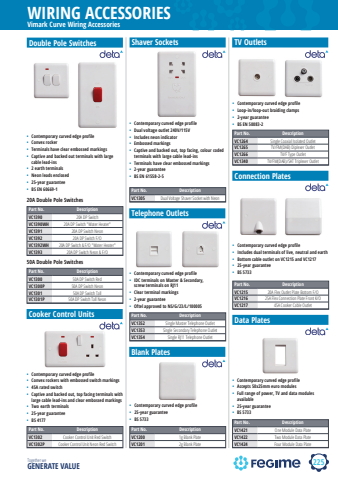 225WIRING ACCESSORIESTogether we GENERATE VALUEVimark Curve Wiring AccessoriesDouble Pole SwitchesCooker Control UnitsPart No. DescriptionVC1302 Cooker Control Unit Red SwitchVC1302P Cooker Control Unit Neon Red Switch%u2022 Contemporary curved edge profile%u2022 Convex rockers with embossed switch markings%u2022 45A rated switch%u2022 Captive and backed out, top facing terminals with large cable lead-ins and clear embossed markings%u2022 Two earth terminals%u2022 25-year guarantee%u2022 BS 4177Shaver SocketsPart No. DescriptionVC1305 Dual Voltage Shaver Socket with Neon%u2022 Contemporary curved edge profile%u2022 Dual voltage outlet 240V/115V%u2022 Includes neon indicator%u2022 Embossed markings%u2022 Captive and backed out, top facing, colour coded terminals with large cable lead-ins%u2022 Terminals have clear embossed markings%u2022 2-year guarantee%u2022 BS EN 61558-2-5Part No. DescriptionVC1390 20A DP SwitchVC1390WH 20A DP Switch \VC1391 20A DP Switch NeonVC1392 20A DP Switch F/OVC1392WH 20A DP Switch & F/O \VC1393 20A DP Switch Neon & F/O%u2022 Contemporary curved edge profile%u2022 Convex rocker%u2022 Terminals have clear embossed markings%u2022 Captive and backed out terminals with large cable lead-ins%u2022 2 earth terminals%u2022 Neon leads enclosed%u2022 25-year guarantee%u2022 BS EN 60669-1Part No. DescriptionVC1300 50A DP Switch RedVC1300P 50A DP Switch NeonVC1301 50A DP Switch TallVC1301P 50A DP Switch Tall Neon20A Double Pole Switches50A Double Pole SwitchesTelephone OutletsPart No. DescriptionVC1352 Single Master Telephone OutletVC1353 Single Secondary Telephone OutletVC1354 Single RJ11 Telephone Outlet%u2022 Contemporary curved edge profile%u2022 IDC terminals on Master & Secondary, screw terminals on RJ11%u2022 Clear terminal markings%u2022 2-year guarantee%u2022 Oftel approved to NS/G/23/L/100005Part No. DescriptionVC1264 Single Coaxial Isolated OutletVC1265 TV/FM(DAB) Diplexer OutletVC1266 TV/F Type OutletVC1340 TV/FM(DAB)/SAT Triplexer Outlet%u2022 Contemporary curved edge profile%u2022 Loop-in/loop-out braiding clamps%u2022 2-year guarantee%u2022 BS EN 50083-2TV OutletsBlank Plates%u2022 Contemporary curved edge profile%u2022 25-year guarantee%u2022 BS 5733Part No. DescriptionVC1200 1g Blank PlateVC1201 2g Blank PlateConnection PlatesPart No. DescriptionVC1215 20A Flex Outlet Plate Bottom F/OVC1216 25A Flex Connection Plate Front K/OVC1217 45A Cooker Cable Outlet%u2022 Contemporary curved edge profile%u2022 Includes dual terminals of live, neutral and earth%u2022 Bottom cable outlet on VC1215 and VC1217%u2022 25-year guarantee%u2022 BS 5733Data PlatesPart No. DescriptionVC1421 One Module Data PlateVC1422 Two Module Data PlateVC1424 Four Module Data Plate%u2022 Contemporary curved edge profile%u2022 Accepts 50x25mm euro modules%u2022 Full range of power, TV and data modules available%u2022 25-year guarantee%u2022 BS 5733