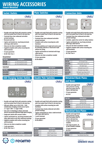 226WIRING ACCESSORIESTogether we GENERATE VALUEVimark MetalcladSocket OutletsPart No. DescriptionM1206 1g 13A Unswitched SocketM1208 2g 13A Unswitched Socket%u2022 Durable and tough finish with protective coating with front plates that fit flush to the back box%u2022 Terminals have clear embossed and white printed markings%u2022 Recessed earth bar%u2022 Captive and backed out, top facing terminals with large cable lead-ins%u2022 Only one size 4mm screwdriver needed%u2022 Supplied complete with surface mounting box with knockouts%u2022 25-year guarantee%u2022 BS EN 1363: Part 2Part No. DescriptionM1207DP 1g 13A Switched Socket DPM1209DP 2g 13A Switched Socket DPUSB Charging Socket Outlets%u2022 Durable and tough finish with protective coating with front plates that fit flush to the back box%u2022 USB ports deliver up to 4.0A (3.0A + 1.0A) simultaneous charging current across 3 ports (1 x Type C USB + 2 x Type A USB)%u2022 Uses auto IC technology to detect connected devices and provide optimised high-speed charging%u2022 Single pole switch with concave rockers%u2022 Captive and backed out, top facing terminals with large cable lead-ins and clear embossed markings%u2022 Supplied complete with surface mounting box with knockouts%u2022 Only one size 4mm screwdriver needed%u2022 2-year guarantee%u2022 BS EN 1363: Part 2Part No. DescriptionM1288 2g 13A SP Switched Socket + 3 USB Ports (4A)Plate SwitchesPart No. DescriptionM1203 1g 2w 10AX Plate SwitchM1204 2g 2w 10AX Plate SwitchM1205 3g 2w 10AX Plate Switch%u2022 Durable and tough finish with protective coating with front plates that fit flush to the back box%u2022 Concave rocker%u2022 Terminals have clear embossed and white printed terminals%u2022 Complete with surface mounting box with knockouts%u2022 All plate switches are X-rated and can be used for switching inductive or fluorescent loads without de-rating%u2022 Captive and backed out terminals with large cable lead-ins%u2022 Only one size 4mm screwdriver needed%u2022 25-year guarantee%u2022 BS EN 60669-1Connection Units%u2022 Durable and tough finish with protective coating with front plates that fit flush to the back box %u2022 Terminals have clear embossed and white printed markings%u2022 Lockable, captive fuse carrier for safety isolation%u2022 Captive and backed out, top facing terminals with large cable lead-ins%u2022 Only one size 4mm screwdriver needed%u2022 Supplied complete with surface mounting box with knockouts%u2022 25-year guarantee%u2022 BS 1363: Part 4Part No. DescriptionM1210 13A Unswitch SpurM1210FL 13A Unswitch Spur & F/OM1211 13A Switch SpurM1211FL 13A Switch Spur & F/OM1212 13A Switch Spur NeonM1212FL 13A Switch Spur Neon & F/OM1217 13A Unswitch Spur NeonDouble Pole SwitchesPart No. DescriptionM1213 20A DP SwitchM1214 20A DP Switch NeonM1300P 50A DP Switch Neon%u2022 Durable and tough finish with protective coating with front plates that fit flush to the back box%u2022 Complete with surface mounting box with knockouts%u2022 Terminals have clearly embossed and white printed markings%u2022 Captive and backed out colour coded terminals with large cable lead-ins%u2022 2 earth terminals%u2022 25-year guarantee%u2022 BS EN 60669-1Metalclad Blank Plates and BoxesPart No. DescriptionM1200 1g Blank PlateM1201 2g Blank PlateM1228N 1g Back Box with No KnockoutsM1229N 2g Back Box with No Knockouts%u2022 Durable and tough finish with protective coating with front plates that fit flush to the back box%u2022 25-year guarantee%u2022 BS 5733Metalclad Data Plates%u2022 Durable and tough finish with protective coating with front plates that fit flush to the back box%u2022 Accepts 50x25mm euro modules%u2022 Full range of power, TV & data modules available%u2022 25-year guarantee%u2022 BS 5733Part No. DescriptionM1222 Two Module Data PlateUnswitchedSwitched