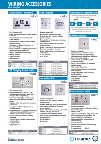 227WIRING ACCESSORIESTogether we GENERATE VALUEUltra FlatplateSocket Outlets - Switched%u2022 Ultra slim metal profile%u2022 Double pole switch with concave colour matched metal rocker%u2022 Terminals have clear embossed and white printed markings%u2022 Protective film on frontplate prevents damage during installation%u2022 Foam gasket pre-fitted to the accessory to prevent tarnishing%u2022 Captive and backed out, top facing, colour coded terminals with large cable lead-ins%u2022 Only one size 4mm screwdriver needed%u2022 Recessed earth bar%u2022 25-year guarantee%u2022 BS EN 1363: Part 2Part No. Description8131 1g 13A Switched Socket DP8132 2g 13A Switched Socket DPUSB Charging Socket OutletsPart No. Description8168 2g 13A SP Sw Skt + 3 USB Ports (4A)%u2022 Ultra slim metal profile%u2022 USB ports deliver up to 4.0A (3.0A + 1.0A) simultaneous charging current across 3 ports (1 x Type C USB + 2 x Type A USB)%u2022 Uses auto IC technology to detect connected devices and provide optimised high-speed charging%u2022 Single pole switch with concave colour matched metal rockers%u2022 Foam gasket pre-fitted to the accessory to prevent tarnishing%u2022 Captive and backed out, top facing, colour coded terminals with large cable lead-ins and clear embossed and white printed markings%u2022 Fits Deta 25mm flush metal and 35mm dry lining boxes%u2022 Protective film on frontplate prevents damage during installation%u2022 2-year guarantee%u2022 BS EN 1363: Part 2Part No. Description8101 1g 2w 10AX Plate Switch8102 2g 2w 10AX Plate Switch8103 3g 2w 10AX Plate Switch8104 4g 2w 10AX Plate Switch8106 1g Intermediate 10AX Plate Switch8107 3 Pole Fan Isolator 10A%u2022 Ultra slim metal profile%u2022 Concave colour matched metal rocker%u2022 Terminals have clear embossed and white printed markings%u2022 Protective film on frontplate prevents damage during installation%u2022 Foam gasket pre-fitted to the accessory to prevent tarnishing%u2022 X-rated, can be used for switching inductive or fluorescent loads without de-rating%u2022 Captive and backed out terminals with large cable lead-ins%u2022 25-year guarantee%u2022 BS EN 60669-1CH or SS with B or WFINISH INSERTSUltra Flatplate Ordering GuideChrome or Stainless Steel Finish available with either Black or White InsertsWhen ordering products please indicate fi nish and insert preference by adding the suffi xes shown above to the Part No.Plate SwitchesConnection Units%u2022 Ultra slim metal profile%u2022 Terminals have clear embossed and white printed markings%u2022 Lockable, captive fuse carrier for safety isolation%u2022 Foam gasket pre-fitted to the accessory to prevent tarnishing%u2022 Captive and backed out, top facing, colour coded terminals with large cable lead-ins%u2022 Only one size 4mm screwdriver needed%u2022 Protective film on frontplate prevents damage during installation%u2022 25-year guarantee%u2022 BS 1363: Part 4Part No. Description8142 13A Switch Spur8143 13A Switch Spur Neon8144 13A Switch Spur Neon & F/ODimmer SwitchesPart No. Description8130 2g 250W Universal Dimmer Multiway8129 2g 250W Universal Dimmer Multiway%u2022 Ultra slim metal profile%u2022 Universal dimmers suitable for use with dimmable LED lamps (requiring leading or trailing edge control), incandescent and halogen lamps or low voltage lighting%u2022 Suitable for loads up to 250W LED, 350W incandescent / halogen%u2022 Push on / push off dimmers are suitable for multiway dimming%u2022 Colour matched dimmer knob%u2022 Protective film on frontplate prevents damage during installation%u2022 Foam gasket pre-fitted to the accessory to prevent tarnishing%u2022 Spare dimmer knobs available%u2022 2-year guarantee%u2022 BS EN 60669-2-1Cooker Control UnitsPart No. Description8154 Cooker Control Unit Neon%u2022 Ultra slim metal profile%u2022 Concave colour matched metal rockers with grey font switch markings%u2022 45A rated switch%u2022 Captive and backed out, top facing, colour coded terminals with large cable lead-ins and clear embossed and white printed markings%u2022 Foam gasket pre-fitted to the accessory to prevent tarnishing%u2022 Two earth terminals%u2022 Protective film on frontplate prevents damage during installation%u2022 25-year guarantee %u2022 BS 4177