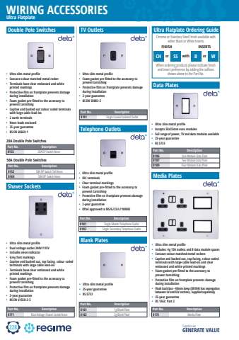 228WIRING ACCESSORIESTogether we GENERATE VALUEPart No. Description8186 One Module Data Plate8187 Two Module Data Plate8189 Four Module Data Plate%u2022 Ultra slim metal profile%u2022 Accepts 50x25mm euro modules%u2022 Full range of power, TV and data modules available%u2022 25-year guarantee%u2022 BS 5733Media PlatesUltra FlatplateCH or SS with B or WFINISH INSERTSUltra Flatplate Ordering GuideChrome or Stainless Steel Finish available with either Black or White InsertsWhen ordering products please indicate fi nish and insert preference by adding the suffi xes shown above to the Part No.Shaver SocketsPart No. Description8171 Dual Voltage Shaver Socket Neon%u2022 Ultra slim metal profile%u2022 Dual voltage outlet 240V/115V%u2022 Includes neon indicator%u2022 Grey font markings%u2022 Captive and backed out, top facing, colour coded terminals with large cable lead-ins%u2022 Terminals have clear embossed and white printed markings%u2022 Foam gasket pre-fitted to the accessory to prevent tarnishing%u2022 Protective film on frontplate prevents damage during installation%u2022 2-year guarantee%u2022 BS EN 61558-2-5Telephone Outlets%u2022 Ultra slim metal profile%u2022 IDC terminals%u2022 Clear terminal markings%u2022 Foam gasket pre-fitted to the accessory to prevent tarnishing%u2022 Protective film on frontplate prevents damage during installation%u2022 2-year guarantee%u2022 Oftel approved to NS/G/23/L/100005Part No. Description8181 Single Master Telephone Outlet8183 Single Secondary Telephone OutletData PlatesPart No. Description8175 Media Plate%u2022 Ultra slim metal profile%u2022 Includes: 4g 13A outlets and 8 data module spaces%u2022 Concave colour matched metal rockers%u2022 Captive and backed out, top facing, colour coded terminals with large cable lead-ins and clear embossed and white printed markings%u2022 Foam gasket pre-fitted to the accessory to prevent tarnishing%u2022 Protective film on frontplate prevents damage during installation%u2022 Flush back box - 40mm deep (DB184) has segregation between LV and ELV sections, Supplied separately%u2022 25-year guarantee%u2022 BS 1363: Part 2TV OutletsPart No. Description8191 Single Coaxial Isolated Outlet%u2022 Ultra slim metal profile%u2022 Foam gasket pre-fitted to the accessory to prevent tarnishing%u2022 Protective film on frontplate prevents damage during installation%u2022 2-year guarantee%u2022 BS EN 50083-2Blank PlatesPart No. Description8161 1g Blank Plate8162 2g Blank Plate%u2022 Ultra slim metal profile%u2022 25-year guarantee%u2022 BS 5733Double Pole SwitchesPart No. Description8152 50A DP Switch Tall Neon8160 50A DP Switch NeonPart No. Description8156 20A DP Switch Neon%u2022 Ultra slim metal profile%u2022 Concave colour matched metal rocker%u2022 Terminals have clear embossed and white printed markings%u2022 Protective film on frontplate prevents damage during installation%u2022 Foam gasket pre-fitted to the accessory to prevent tarnishing%u2022 Captive and backed out colour coded terminals with large cable lead-ins%u2022 2 earth terminals%u2022 Neon leads enclosed%u2022 25-year guarantee%u2022 BS EN 60669-120A Double Pole Switches50A Double Pole Switches