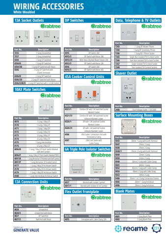 231WIRING ACCESSORIESTogether we GENERATE VALUEcrabtreeWhite MouldedPart No. Description7255 1 Gang Unswitched7257 2 Gang Unswitched4304 1 Gang SP Switched4304/D 1 Gang DP Switched4304/3D 1 Gang DP Switched with Neon4306 2 Gang SP Switched with2 Earth Terminals4306/D 2 Gang DP Switched4306/3D 2 Gang DP Switched with Neons4306/USB/D 2 Gang DP Switched with 2 x USB Outlets13A Socket Outlets10AX Plate SwitchesPart No. Description4070 1 Gang 1 Way SP4170 1 Gang 2 Way SP4171 1 Gang 1 Way DP4172 2 Gang 2 Way SP4173 3 Gang 2 Way SP4174 4 Gang 2 Way SP4175 1 Gang Intermediate4176 6 Gang 2 Way SP4096/B 1 Gang 1 Way SP Push Switch Markedwith Bell Symbol4096/P 1 Gang 2 Way SP Push Switch Marked PRESS4097/B 1 Gang Retractive SP Marked with Bell Symbol4097/P 1 Gang Retractive SP marked %u2018press%u20194177 1 Gang 2 Way SP Architrave Switch4178 2 Gang 2 Way SP Architrave Switch4179 1 Gang 1 Way DP Architrave Switch4180 1 Gang Intermediate Architrave SwitchPart No. Description4828 Unswitched4828/3 Unswitched with Neon4827 DP Switched4827/3 Switched with Neon13A Connection UnitsPart No. Description4015 DP Switch 20A4015/3 DP Switch with Neon 20A4015/31 With Neon Marked Water Heater 20A4013/3 DP Switch with Neon 32A4016 DP Switch 45A4016/3 DP Switch with Neon 45ADP SwitchesPart No. Description4521/1 Slimline DP with 13A Switched SocketMarked Cooker4521/31 Slimline DP with 13A Switched Socket& Neons Marked Cooker4520/1 DP with 13A Switched SocketMarked Cooker4520/31 DP with 13A Switched Socket& Neons Marked Cooker4506 45A Cooker Connection Unit withTerminals & Clamp4507 20A Cord Outlet withCable Clamp45A Cooker Control Units6A Triple Pole Isolator SwitchesPart No. Description4017 Marked with Isolator Symbol4017/1 Marked with Isolator & Fan SymbolFlex Outlet FrontplatePart No. Description4075 Frontplate with Cable Clamp 20APart No. Description7283 1 Gang BT Master Phone7284 1 Gang BT Secondary Phone7286 1 Gang RJ11 Phone Socket7265 Single Non-Isolated TV/Co-Axial Socket7266 Twin Non-Isolated TV/Co-Axial Sockets7267 Single Isolated TV/Co-Axial Socket7268 Twin Isolated TV/Co-Axial SocketsData, Telephone & TV OutletsShaver OutletPart No. Description2400 Dual Voltage Outlet 115V/240VSurface Mounting BoxesPart No. Description9043 20mm 1 Gang with Earth Terminal9047 29mm 1 Gang9048 29mm 2 Gang9048/1 29mm 2 Gang with Earth Terminal9049 32mm 1 Gang9050 32mm 2 Gang9040 34mm 2 Gang with Cable Clamp9041 44mm 1 Gang9052 45mm 2 Gang with Cable Clamp9054 49mm 2 Gang with Cable Clamp9053 49mm 2 Gang9406 20mm 1 to 2 Gang Conversion Patress4005 20mm 1 Gang Architrave4006 20mm 2 Gang ArchitraveBlank PlatesPart No. Description4001 1 Gang Blank Plate4002 2 Gang Blank Plate