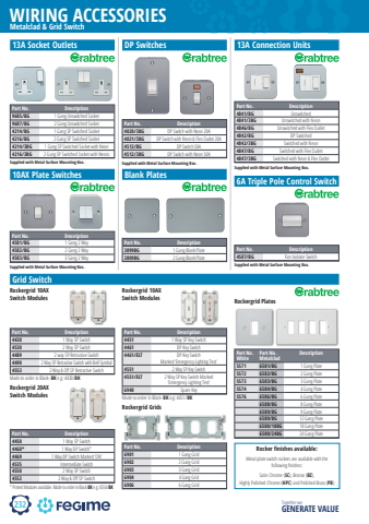 232WIRING ACCESSORIESTogether we GENERATE VALUEMetalclad & Grid SwitchPart No. Description9685/BG 1 Gang Unswitched Socket9687/BG 2 Gang Unswitched Socket4214/BG 1 Gang SP Switched Socket4216/BG 2 Gang SP Switched Socket4214/3BG 1 Gang SP Switched Socket with Neon4216/3BG 2 Gang SP Switched Socket with Neons13A Socket OutletsSupplied with Metal Surface Mounting Box.Part No. Description4581/BG 1 Gang 2 Way4582/BG 2 Gang 2 Way4583/BG 3 Gang 2 Way10AX Plate SwitchesSupplied with Metal Surface Mounting Box.Part No. Description4020/3BG DP Switch with Neon 20A4021/3BG DP Switch with Neon & Flex Outlet 20A4512/BG DP Switch 50A4512/3BG DP Switch with Neon 50ADP SwitchesSupplied with Metal Surface Mounting Box.Part No. Description3899BG 1 Gang Blank Plate3809BG 2 Gang Blank PlateBlank PlatesPart No. Description4841/BG Unswitched4841/3BG Unswitched with Neon4846/BG Unswitched with Flex Outlet4842/BG DP Switched4842/3BG Switched with Neon4847/BG Switched with Flex Outlet4847/3BG Switched with Neon & Flex Outlet13A Connection UnitsSupplied with Metal Surface Mounting Box.6A Triple Pole Control SwitchPart No. Description4587/BG Fan Isolator SwitchSupplied with Metal Surface Mounting Box.Grid SwitchRocker fi nishes available: Metal plate switch rockers are available with the following fi nishes:Satin Chrome (SC), Bronze (BZ), Highly Polished Chrome (HPC) and Polished Brass (PB)Rockergrid 10AX Switch ModulesPart No. Description4430 1 Way SP Switch4530 2 Way SP Switch4489 2 way SP Retractive Switch4490 2 Way SP Retractive Switch with Bell Symbol4553 2 Way & Off SP Retractive SwitchRockergrid 20AX Switch ModulesPart No. Description4450 1 Way SP Switch4460* 1 Way DP Switch*4469 1 Way DP Switch Marked %u2018ON%u20194535 Intermediate Switch4550 2 Way SP Switch4552 2 Way & Off SP SwitchMade to order in Black- BK e.g: 4430/BK* Printed Modules available. Made to order in Black BK e.g: 4550/BKRockergrid 10AX Switch ModulesPart No. Description4451 1 Way SP Key Switch4461 DP Key Switch4461/ELT DP Key SwitchMarked %u2018Emergency Lighting Test%u20194551 2 Way SP Key Switch4551/ELT 2 Way SP Key Switch Marked%u2018Emergency Lighting Test%u20196940 Spare KeyMade to order in Black- BK e.g: 4451/BKRockergrid GridsPart No. Description6901 1 Gang Grid6902 2 Gang Grid6903 3 Gang Grid6904 4 Gang Grid6906 6 Gang GridRockergrid PlatesPart No.White Part No.MetalcladDescription5571 6581/BG 1 Gang Plate5572 6582/BG 2 Gang Plate5573 6583/BG 3 Gang Plate5574 6584/BG 4 Gang Plate5576 6586/BG 6 Gang Plate6588/BG 8 Gang Plate6589/BG 9 Gang Plate6580/BG 12 Gang Plate6580/18BG 18 Gang Plate6580/24BG 24 Gang Plate