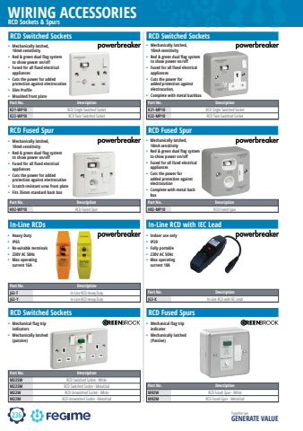 236WIRING ACCESSORIESTogether we GENERATE VALUERCD Sockets & SpursRCD Switched Sockets%u2022 Mechanically latched, 10mA sensitivity%u2022 Red & green dual flag system to show power on/off%u2022 Fused for all fixed electrical appliances%u2022 Cuts the power for added protection against electrocution%u2022 Slim Profile%u2022 Moulded front plate%u2022 Fits standard 35mm back boxRCD Switched SocketsPart No. DescriptionJ62-T In-Line RCD Heavy DutyJ62-Y In-Line RCD Heavy Duty%u2022 Mechanically latched, 10mA sensitivity%u2022 Red & green dual flag system to show power on/off%u2022 Fused for all fixed electrical appliances%u2022 Cuts the power for added protection against electrocution,%u2022 Complete with metal backboxRCD Fused SpurPart No. DescriptionH92-WP10 RCD Fused Spur%u2022 Mechanically latched, 10mA sensitivity%u2022 Red & green dual flag system to show power on/off%u2022 Fused for all fixed electrical appliances%u2022 Cuts the power for added protection against electrocution%u2022 Scratch resistant urea front plate%u2022 Fits 35mm standard back boxRCD Fused Spur%u2022 Mechanically latched, 10mA sensitivity%u2022 Red & green dual flag system to show power on/off%u2022 Fused for all fixed electrical appliances%u2022 Cuts the power for added protection against electrocution%u2022 Complete with metal back boxPart No. DescriptionH92-MP10 RCD Fused SpurIn-Line RCDs%u2022 Heavy Duty%u2022 IP65%u2022 Re-wirable terminals%u2022 230V AC 50Hz%u2022 Max operating current 16AIn-Line RCD with IEC Lead%u2022 Indoor use only%u2022 IP20%u2022 Fully portable%u2022 230V AC 50Hz%u2022 Max operating current 10APart No. DescriptionM92W RCD Fused Spur - WhiteM92M RCD Fused Spur - MetalcladRCD Switched SocketsPart No. DescriptionM22SW RCD Switched Socket - WhiteM22SM RCD Switched Socket - MetalcladM22W RCD Unswitched Socket - WhiteM22M RCD Unswitched Socket - Metalclad%u2022 Mechanical flag trip indicators%u2022 Mechanically latched (passive)RCD Fused Spurs%u2022 Mechanical flag trip indicator%u2022 Mechanically latched (Passive)Part No. DescriptionJ63-X In-Line RCD with IEC LeadPart No. DescriptionK21-WP10 RCD Single Switched SocketK22-WP10 RCD Twin Switched SocketPart No. DescriptionK21-MP10 RCD Single Switched SocketK22-MP10 RCD Twin Switched Socket