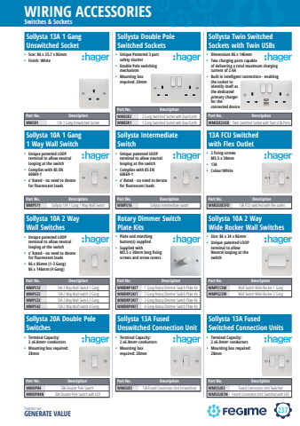 237WIRING ACCESSORIESTogether we GENERATE VALUEhagerSwitches & SocketsSollysta 13A 1 Gang Unswitched SocketSollysta Double PoleSwitched Sockets%u2022 Unique Patented 3 part safety shutter%u2022 Double Pole switching mechanism %u2022 Mounting box required: 20mmSollysta Twin SwitchedSockets with Twin USBsPart No. DescriptionWMSS82 2 Gang Swtiched Socket with Dual EarthWMSS81 1 Gang Switched Socket with Dual EarthPart No. DescriptionWMS81 13A 1 Gang Unswitched SocketPart No. DescriptionWMSS82USB Twin Switched Socket with Twin USB Ports%u2022 Size: 86 x 25.7 x 86mm%u2022 Finish: White%u2022 Dimensions 86 x 146mm%u2022 Two charging ports capable of delivering a total maximum charging current of 2.4ASollysta 10A 1 Gang1 Way Wall SwitchSollysta IntermediateSwitch%u2022 Unique patented LOOP terminal to allow neutral looping at the switch%u2022 Complies with BS EN 60669-1%u2022 x%u2019 Rated - no need to derate for fluorescent loadsSollysta 10A 2 Way Wall SwitchesPart No. DescriptionWMPS12 10A 2 Way Wall Switch 1 GangWMPS22 10A 2 Way Wall switch 2 GangWMPS32 10A 2 Way Wall Switch 3 GangWMPS42 10A 2 Way Wall switch 4 GangPart No. DescriptionWMPS11 Sollysta 10A 1 Gang 1 Way Wall SwitchPart No. DescriptionWMPS16 Sollysta Intermediate switch%u2022 Unique patented LOOP terminal to allow neutral looping at the switch%u2022 Complies with BS EN 60669-1%u2022 x%u2019 Rated - no need to derate for fluorescent loads%u2022 Unique patented LOOP terminal to allow neutral looping at the switch%u2022 x%u2019 Rated - no need to derate for fluorescent loads%u2022 86 x 86mm (1-3 Gang) 86 x 146mm (4 Gang)13A FCU Switched with Flex OutletRotary Dimmer Switch Plate KitsSollysta 10A 2 Way Wide Rocker Wall Switches Part No. DescriptionWMPS12W Wall Switch Wide Rocker 1 GangWMPS22W Wall Switch Wide Rocker 2 GangPart No. DescriptionWMSSU83FO 13A FCU switched with fl ex outletSollysta 20A Double Pole SwitchesSollysta 13A Fused Unswitched Connection UnitSollysta 13A Fused Switched Connection UnitsPart No. DescriptionWMSSU83 Fused Connection Unit SwitchedWMSSU83N Fused Connection Unit Switched with LEDPart No. DescriptionWMSU83 13A Fused Connection Unit Unswitched%u2022 Plate and matching button(s) supplied%u2022 Supplied with M3.5 x 30mm long fixing screws and screw covers%u2022 2 fixing screws M3.5 x 30mm%u2022 13A%u2022 Colour:White%u2022 Size: 86 x 24 x 86mm%u2022 Unique patented LOOP terminal to allow Neutral looping at the switch%u2022 Terminal Capacity: 2 x6.0mm2 conductors%u2022 Mounting box required: 28mm%u2022 Terminal Capacity: 2 x6.0mm2 conductors%u2022 Mounting box required: 28mm%u2022 Terminal Capacity: 2 x6.0mm2 conductors%u2022 Mounting box required: 28mmPart No. DescriptionWMDRP1KIT 1 Gang Rotary Dimmer Switch Plate KitWMDRP2KIT 2 Gang Rotary Dimmer Switch Plate KitWMDRP3KIT 3 Gang Rotary Dimmer Switch Plate KitWMDRP4KIT 4 Gang Rotary Dimmer Switch Plate KitPart No. DescriptionWMDP84 20A Double Pole SwitchWMDP84N 20A Double Pole Switch with LED%u2022 Built in intelligent connection - enabling the socket to identify itself as the dedicated primary charger for the connected device