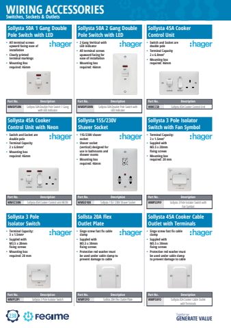 238WIRING ACCESSORIESTogether we GENERATE VALUESwitches, Sockets & OutletsSollysta 50A 1 Gang Double Pole Switch with LEDSollysta 50A 2 Gang Double Pole Switch with LED%u2022 2 Gang Veritical with LED indicator%u2022 All terminal screws upaward facing for ease of installation%u2022 Mounting box required: 46mmSollysta 45A Cooker Control UnitPart No. DescriptionWMDP50N Sollysta 50A Double Pole Switch 1 Gang with LED IndicatorPart No. DescriptionWMDP50VN Sollysta 50A Double Pole Switch with LED Indicator%u2022 All terminal screws upward facing ease of installation%u2022 Clearly printed terminal markings%u2022 Mounting Box required: 46mm%u2022 Switch and Socket are double pole%u2022 Terminal Capacity 2 x 6.0mm2%u2022 Mounting box required: 46mmSollysta 45A Cooker Control Unit with NeonSollysta 155/230V Shaver Socket%u2022 115/230V shaver socket%u2022 Shaver socket (vertical) designed for use in bathrooms and shower rooms%u2022 Mounting box required: 46mmSollysta 3 Pole Isolator Switch with Fan Symbol%u2022 Switch and Socket are double pole%u2022 Terminal Capacity 2 x 6.0mm2%u2022 Mounting box required: 46mm%u2022 Terminal Capacity: 3 x 1.5mm2%u2022 Suppled with M3.5 x 20mm fixing screws%u2022 Mounting box required: 20 mmSollysta 3 Pole Isolator SwitchSollsta 20A Flex Outlet Plate%u2022 Singe screw fast fix cable clamp%u2022 Suppled with M3.5 x 30mm fixing screws%u2022 Protective red washer must be used under cable clamp to prevent damage to cableSollysta 45A Cooker Cable Outlet with Terminals%u2022 Terminal Capacity: 3 x 1.5mm2%u2022 Suppled with M3.5 x 20mm fixing screws%u2022 Mounting box required: 20 mm%u2022 Singe screw fast fix cable clamp%u2022 Suppled with M3.5 x 30mm fixing screws%u2022 Protective red washer must be used under cable clamp to prevent damage to cablePart No. DescriptionWMCC50 Sollysta 45A Cooker Control UnitPart No. DescriptionWMCC50N Sollysta 45A Cooker Control unit NEONPart No. DescriptionWMSO100 Sollysta 155/ 230V Shaver SocketPart No. DescriptionWMPS3PIF Sollysta 3 Pole Isolator Switch with Fan SymbolPart No. DescriptionWMPS3PI Sollysta 3 Pole Isolator SwitchPart No. DescriptionWMP2FO Sollsta 20A Flex Outlet PlatePart No. DescriptionWMP50FO Sollysta 45A Cooker Cable Outlet with Terminals