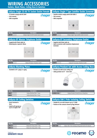239WIRING ACCESSORIESTogether we GENERATE VALUEOutlets, Blank Plates, Ceiling Rose & SwitchesSollysta Single CO-AX TV Socket Outlet Female Sollysta Single F Type Satellite Outlet ScreenedPart No. DescriptionWMSAT Sollysta Single F Type Satellite Outlet ScreenedPart No. DescriptionWMTVF Sollysta Single CO-AX TV Socket Outlet Female%u2022 TV Outlets comply with BS 3041%u2022 Full screened%u2022 DAB compatible%u2022 Satellite outlets comply with BS EN 5083-2%u2022 Full screened%u2022 DAB compatibleSollysta BT Master Telephone Outlet Sollysta BT Secondary Telephone OutletPart No. DescriptionWMBTS Sollysta BT Secondary Telephone OutletPart No. DescriptionWMBTM Sollysta BT Master Telephone Outlet%u2022 Supplied with fitted cable tie%u2022 Mounting box required: 28mm%u2022 Supplied with fitted cable tie%u2022 Quick connection with insulation displacement terminalsSollysta Blanking Plates Sollysta Pendant Set with Access Ceiling RosePart No. Description624SEL212/6 Sollysta Pendant Set with Access Ceiling RosePart No. DescriptionWMP1 Sollysta Blanking Plate 1 GangWMP2 Sollysta Blanking Plate 2 Gang%u2022 Available to fit 1 gang or 2 gang %u2022 Pendant set with access ceiling rose%u2022 Safety pendant set 6%u201d - short skirtSollysta 6A Ceiling Switches Sollysta 50A 2 Pole Isolating Ceiling Switch%u2022 Earth Terminal in base%u2022 Switch will operate at up to an angle of 45%u00ba%u2022 Suitable for use with showers up to 11.5kW%u2022 Position of the contacts shown by flag indicatorPart No. DescriptionWMCS50N Sollysta 50A 2 Pole Isolating Ceiling Switch with LED IndicatorPart No. DescriptionWMCS11 Sollysta 6A Ceiling Switch 1 WayWMCS12 Sollysta 6A Ceiling Switch 2 Way