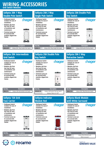 240WIRING ACCESSORIESTogether we GENERATE VALUEGrid Switch ModulesSollysta 20A 1 Way Double Pole SwitchSollysta 20A 2 Way Single Pole Switch%u2022 Shallowest Switch modules for ease of installation%u2022 Modules clip from the front for ease of installation and maintenance%u2022 Terminal screw can be accessed with modules clipped into framesSollysta 20A Double Pole Key SwitchPart No. DescriptionWMGSDP2 Sollysta 20A 1 Way Double Pole SwitchPart No. DescriptionWMGS12 Sollysta 20A 2 Way Single Pole Switch%u2022 Shallowest Switch modules for ease of installation%u2022 Modules clip from the front for ease of installation and maintenance%u2022 Terminal screw can be accessed with modules clipped into frames%u2022 Shallowest Switch modules for ease of installation%u2022 Modules clip from the front for ease of installation and maintenance%u2022 Terminal screw can be accessed with modules clipped into framesSollysta 20A Intermediate Grid SwitchSollysta 20A Double Pole Key Switch%u2022 Shallowest Switch modules for ease of installation%u2022 Modules clip from the front for ease of installation and maintenance%u2022 Terminal screw can be accessed with modules clipped into framesSollysta 20A 2 Way Retractive Switch%u2022 Shallowest Switch modules for ease of installation%u2022 Modules clip from the front for ease of installation and maintenance%u2022 Terminal screw can be accessed with modules clipped into frames%u2022 Shallowest Switch modules for ease of installation%u2022 Modules clip from the front for ease of installation and maintenance%u2022 Terminal screw can be accessed with modules clipped into framesSollysta 13A Grid Fuse CarrierSollysta Indicator Module Red%u2022 Shallowest Switch modules for ease of installation%u2022 Modules clip from the front for ease of installation and maintenance%u2022 Terminal screw can be accessed with modules clipped into framesSollysta Blank Module with White Surround%u2022 Shallowest Switch modules for ease of installation%u2022 Modules clip from the front for ease of installation and maintenance%u2022 Terminal screw can be accessed with modules clipped into frames%u2022 Shallowest Switch modules for ease of installation%u2022 Modules clip from the front for ease of installation and maintenance%u2022 Terminal screw can be accessed with modules clipped into framesPart No. DescriptionWMGKS Sollysta 20A Double Pole Key SwitchPart No. DescriptionWMGS16 Sollysta 20A Intermediate Grid SwitchPart No. DescriptionWMGKS/EL Sollysta 20A Double Pole Key Switch Marked %u201cEMG LTG TEST%u201dPart No. DescriptionWMGS22R Sollysta 20A 2 Way Retractive SwitchPart No. DescriptionWMGFU13 Sollysta 13A Grid Fuse CarrierPart No. DescriptionWMINDRED Sollysta Indicator Module RedPart No. DescriptionWMGB1 Sollysta Blank Module with White Surround