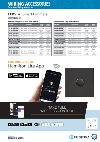 243WIRING ACCESSORIESTogether we GENERATE VALUEDecorative Wiring AccessoriesLEDSTAT Smart DimmersTAKE FULL WIRELESS CONTROLGET IT ONGET IT ONHamilton Lite AppCONTROL VIA THE Hamilton Rotary MASTER Wi-Fi 250W Dimmer Hamilton Rotary Companion Controller HARTLAND BOX-FIX Part No. Description Plate FinishKnob Finish7A 1XL-SD250MW Rotary Master Wi-Fi 250W Dimmer Anthra Gray Anthra Gray79 1XL-SD250MW Rotary Master Wi-Fi 250W Dimmer Antique BrassAntique Brass78 1XL-SD250MW Rotary Master Wi-Fi 250W Dimmer Black Nickel Black Nickel77 1XL-SD250MW Rotary Master Wi-Fi 250W Dimmer Bright ChromeBright Chrome7MB 1XL-SD250MW Rotary Master Wi-Fi 250W Dimmer Matt Black Matt Black7MW 1XL-SD250MW Rotary Master Wi-Fi 250W Dimmer Matt White Matt White71 1XL-SD250MW Rotary Master Wi-Fi 250W Dimmer Polished BrassPolished Brass7RB 1XL-SD250MW Rotary Master Wi-Fi 250W Dimmer Richmond BronzeRichmond Bronze72 1XL-SD250MW Rotary Master Wi-Fi 250W Dimmer Satin Brass Satin Brass74 1XL-SD250MW Rotary Master Wi-Fi 250W Dimmer Satin StainlessSatin StainlessPart No. Description Plate FinishKnob Finish7A 1XL-SD-COMP Rotary Companion Controller Anthra Gray Anthra Gray79 1XL-SD-COMP Rotary Companion Controller Antique BrassAntique Brass78 1XL-SD-COMP Rotary Companion Controller Black Nickel Black Nickel77 1XL-SD-COMP Rotary Companion Controller Bright ChromeBright Chrome7MB 1XL-SD-COMP Rotary Companion Controller Matt Black Matt Black7MW 1XL-SD-COMP Rotary Companion Controller Matt White Matt White71 1XL-SD-COMP Rotary Companion Controller Polished BrassPolished Brass7RB 1XL-SD-COMP Rotary Companion Controller Richmond BronzeRichmond Bronze72 1XL-SD-COMP Rotary Companion Controller Satin Brass Satin Brass74 1XL-SD-COMP Rotary Companion Controller Satin StainlessSatin Stainless