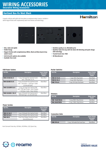 246WIRING ACCESSORIESTogether we GENERATE VALUEDecorative Wiring AccessorieshamiltonPart No. Description Insert Finish/Surround Colour7MB SS1 BL-B 1 Gang 13A Double Pole Switched Socket Black/Black7MB SS2 BL-B 2 Gang 13A Double Pole Switched Socket Black/Black7MB SHS B Shaver Dual Voltage Unswitched Socket (Vertically Mounted)Black/BlackPart No. Description Insert Finish/Surround Colour7MB SS1USB BL-B 1 Gang 13A Single Pole Switched Socket with 1 USB Outlet 1x2.1ABlack/Black7MB SS2USBC BL-B 2 Gang 13A Double Pole Switched Socket with 1 USB Outlet + 1 USB Type C Outlet 2x2.4A (4.8A Total)Black/Black7MB SS2USBPD BL-B 2 Gang 13A Single Pole Switched 45W with 1 USB Type A Outlet - Quick Charging - + 1 USB Type C Outlet - Power DeliveryBlack/Black7MB SS2USBC+C BL-B 2 gang 13A Double Pole Switched with 2 USB Outlet Type C 2x2.4A (4.8A Total)Black/BlackPart No. Description Knob Colour Finish7MB 1XLEDITB250 1 Gang 250W 2-Way Dimmer Matt Black7MB 2XLEDITB250 2 Gang 250W 2-Way Dimmer Matt BlackPart No. Description Insert Finish/Surround Colour7MB SP BL-B 1 Gang 13A Double Pole Fused Spur Black/BlackPart No. Description Insert Finish/Surround Colour7MB R21 BL-B 1 Gang 10AX 2 Way Rocker Black/Black7MB R22 BL-B 2 Gang 10AX 2 Way Rocker Black/Black7MB TP BL-B 1 Gang 10A Triple Pole Rocker Black/BlackHartland Box-Fix Matt Black%u2022 Slim, sleek and stylish%u2022 Visible fixings%u2022 Elegant finishes with complementary White, Black and New Quartz Grey switch inserts%u2022 Grid & EuroFix options also available%u2022 Available from stock%u2022 Hamilton quality at an affordable price%u2022 Hamilton leads the way with the latest LED dimming and quick charge USB technology%u2022 Trusted brand since 1968%u2022 UK ManufacturerA popular collection with stylish slim front plates to complement today's interiors. Available in twelve elegant fi nishes with complementary switch insert fi nishes and visible fi xings.Power SocketsUSB Power SocketsDimmersConnection UnitsRocker SwitchesInsert Surround Colour Key: (-B) Black, (-W) White, (-QG) Quartz Grey
