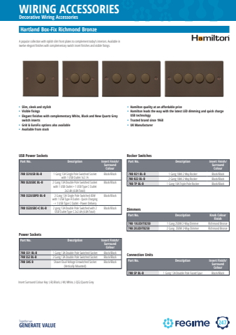 247WIRING ACCESSORIESTogether we GENERATE VALUEDecorative Wiring AccessorieshamiltonPart No. Description Insert Finish/Surround Colour7RB SS1 BL-B 1 Gang 13A Double Pole Switched Socket Black/Black7RB SS2 BL-B 2 Gang 13A Double Pole Switched Socket Black/Black7RB SHS B Shaver Dual Voltage Unswitched Socket (Vertically Mounted)Black/BlackPart No. Description Insert Finish/Surround Colour7RB SS1USB BL-B 1 Gang 13A Single Pole Switched Socket with 1 USB Outlet 1x2.1ABlack/Black7RB SS2USBC BL-B 2 Gang 13A Double Pole Switched Socket with 1 USB Outlet + 1 USB Type C Outlet 2x2.4A (4.8A Total)Black/Black7RB SS2USBPD BL-B 2 Gang 13A Single Pole Switched 45W with 1 USB Type A Outlet - Quick Charging - + 1 USB Type C Outlet - Power DeliveryBlack/Black7RB SS2USBC+C BL-B 2 gang 13A Double Pole Switched with 2 USB Outlet Type C 2x2.4A (4.8A Total)Black/BlackPart No. Description Knob Colour Finish7RB 1XLEDITB250 1 Gang 250W 2-Way Dimmer Richmond Bronze7RB 2XLEDITB250 2 Gang 250W 2-Way Dimmer Richmond BronzePart No. Description Insert Finish/Surround Colour7RB SP BL-B 1 Gang 13A Double Pole Fused Spur Black/BlackPart No. Description Insert Finish/Surround Colour7RB R21 BL-B 1 Gang 10AX 2 Way Rocker Black/Black7RB R22 BL-B 2 Gang 10AX 2 Way Rocker Black/Black7RB TP BL-B 1 Gang 10A Triple Pole Rocker Black/BlackHartland Box-Fix Richmond Bronze%u2022 Slim, sleek and stylish%u2022 Visible fixings%u2022 Elegant finishes with complementary White, Black and New Quartz Grey switch inserts%u2022 Grid & EuroFix options also available%u2022 Available from stock%u2022 Hamilton quality at an affordable price%u2022 Hamilton leads the way with the latest LED dimming and quick charge USB technology%u2022 Trusted brand since 1968%u2022 UK ManufacturerA popular collection with stylish slim front plates to complement today's interiors. Available in twelve elegant fi nishes with complementary switch insert fi nishes and visible fi xings.Power SocketsUSB Power SocketsDimmersConnection UnitsRocker SwitchesInsert Surround Colour Key: (-B) Black, (-W) White, (-QG) Quartz Grey